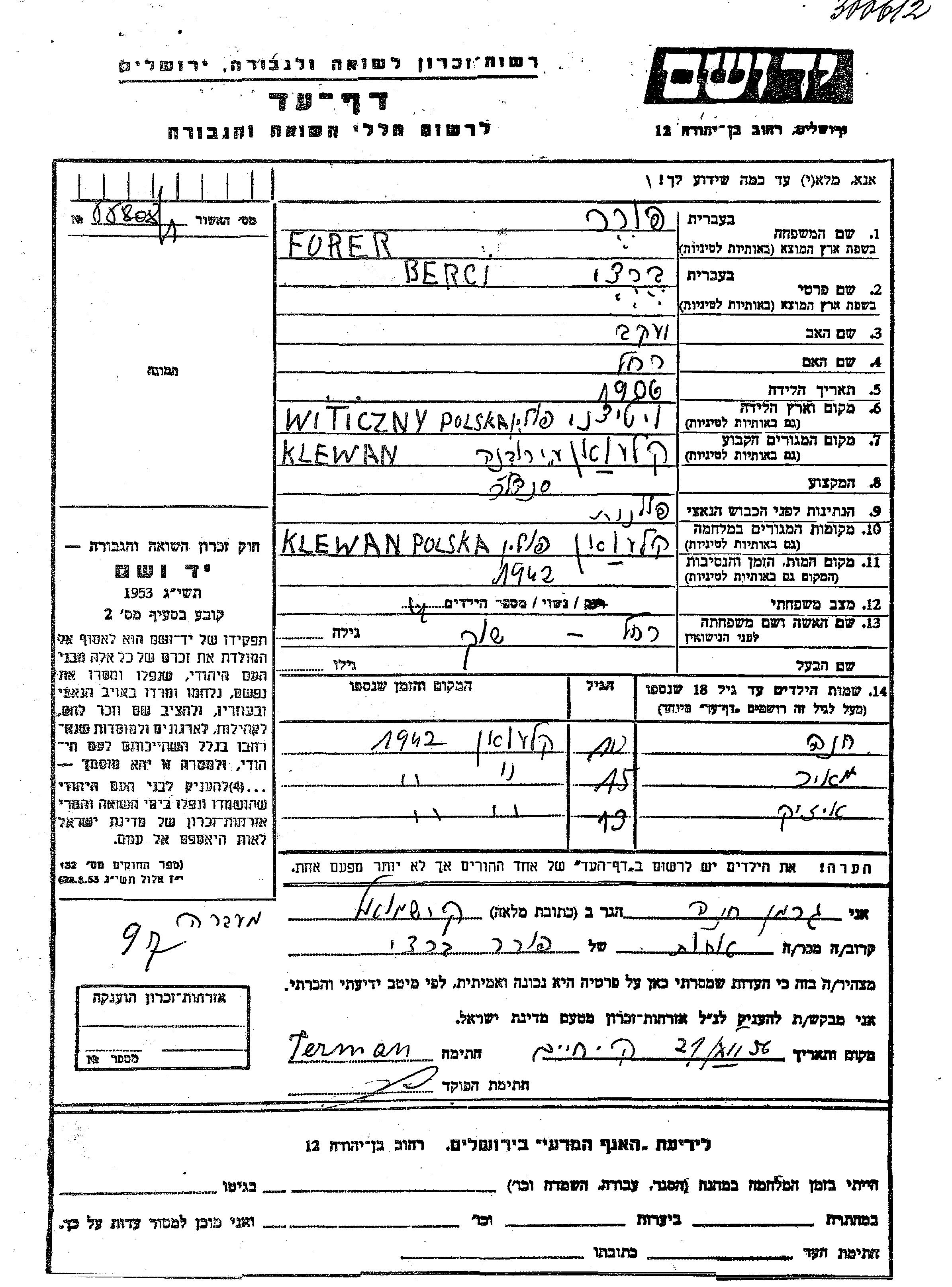 Berci Forer Furer wurde im Jahr 1906 in Wytyczno, Polen geboren. Er war der Sohn von Yaakov und Rakhel. Er war Schuster/-in und mit Rakhel, geb. Shukh Verheiratet. Vor dem Zweiten Weltkrieg lebte er in Klewań, Polen. Während des Krieges war er in Klewań, Polen.