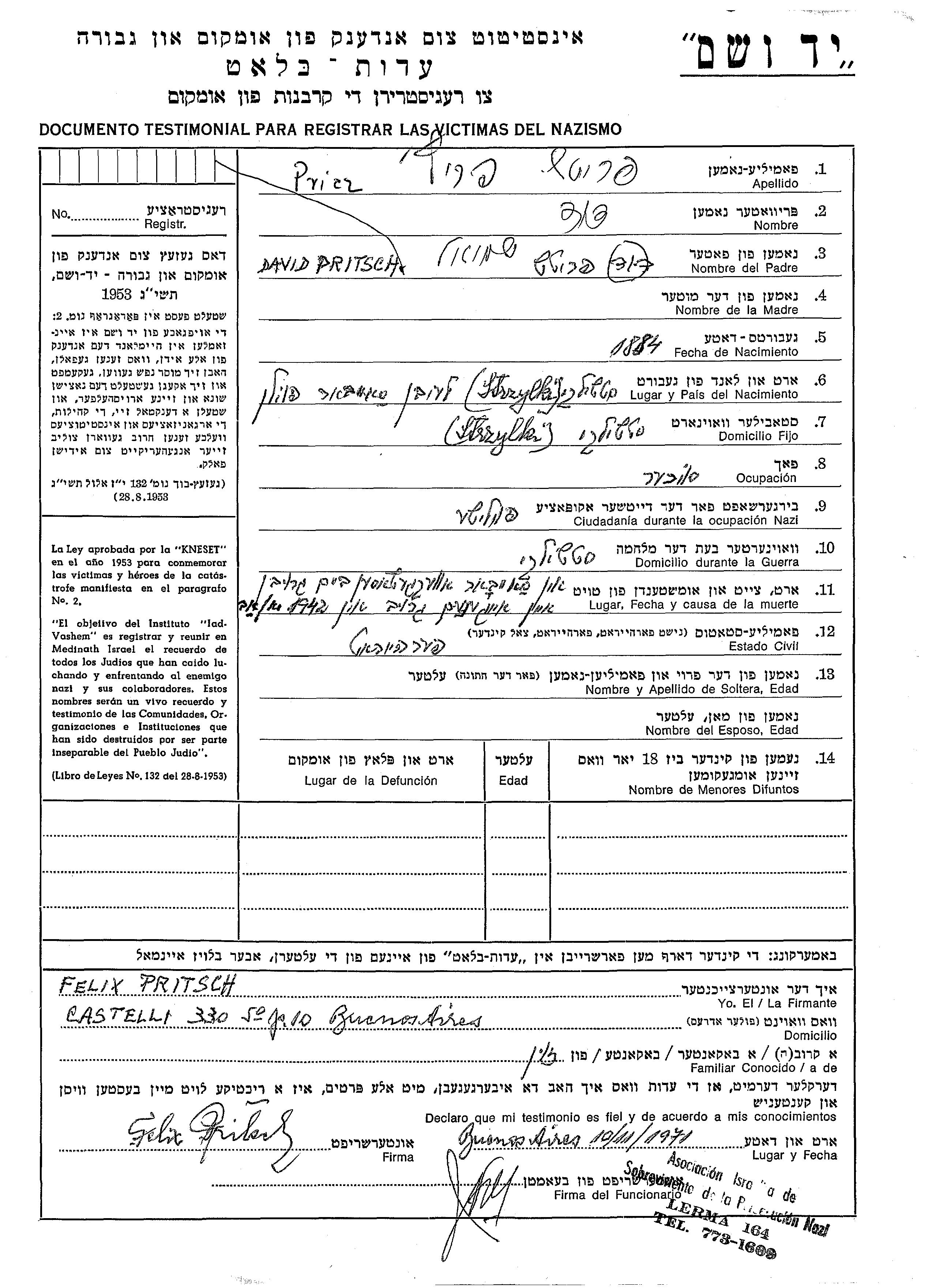 David Pricz Fritz wurde im Jahr 1884 in Strzylki, Polen geboren. Er war der Sohn von Shmuel. Er war Kaufmann/-frau und Verheiratet. Vor dem Zweiten Weltkrieg lebte er in Strzylki, Polen. Während des Krieges war er in Strzylki, Polen.