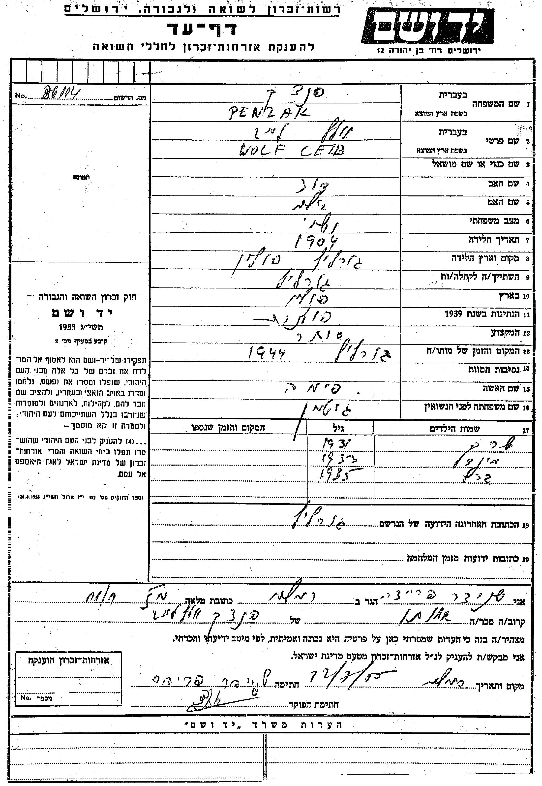Wolf Leib Penzak wurde im Jahr 1904 in Gorlits, Polen geboren. Er war der Sohn von David und Bila. Er war Kaufmann/-frau und mit Fima, geb. Gitman Verheiratet. Vor dem Zweiten Weltkrieg lebte er in Gorlits, Polen. Während des Krieges war er in Gorlits, Polen.