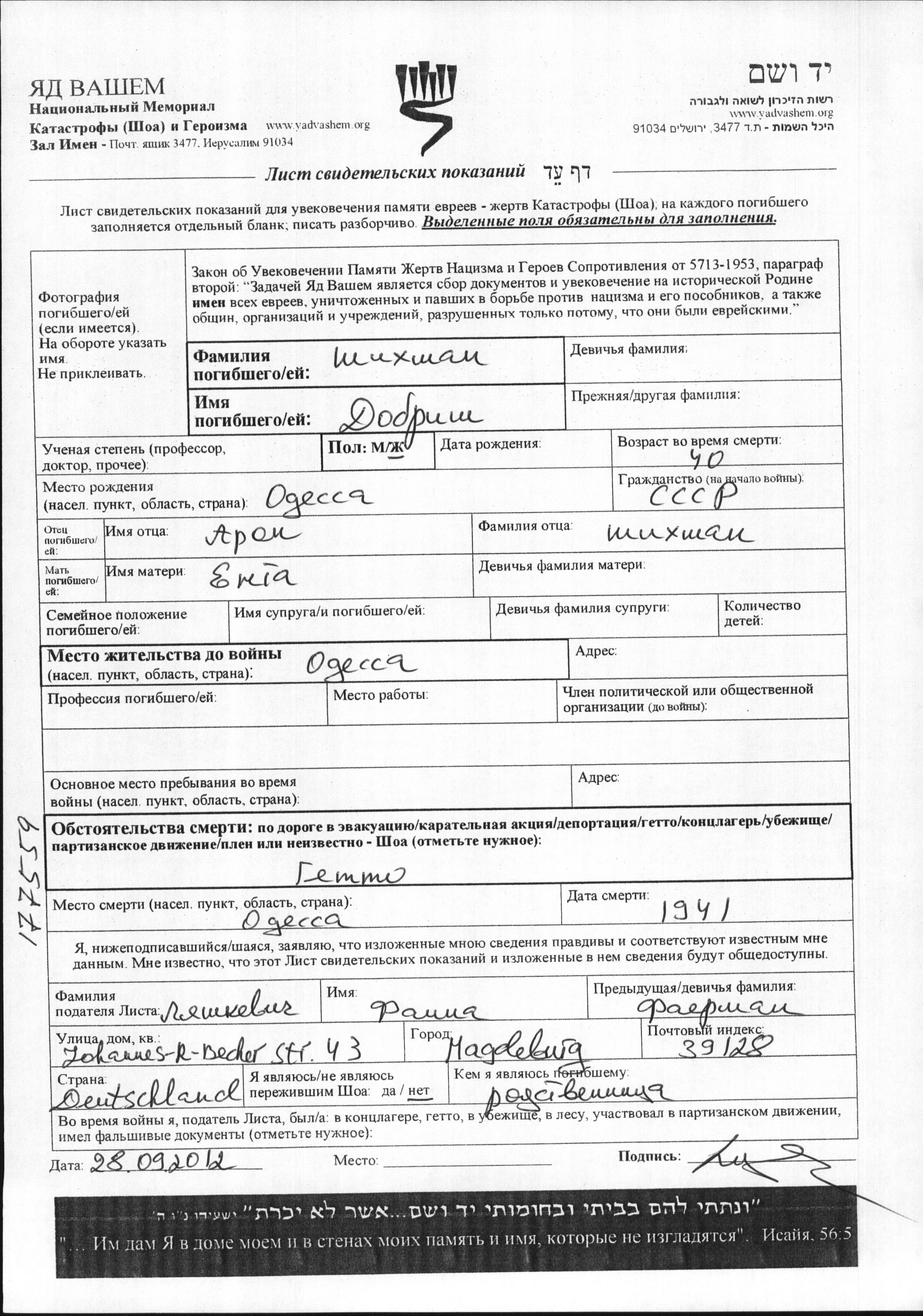 Dobrish wurde in der Schoah ermordet. Todesort: Odessa, Ukraine (UdSSR) im Jahr 1941.