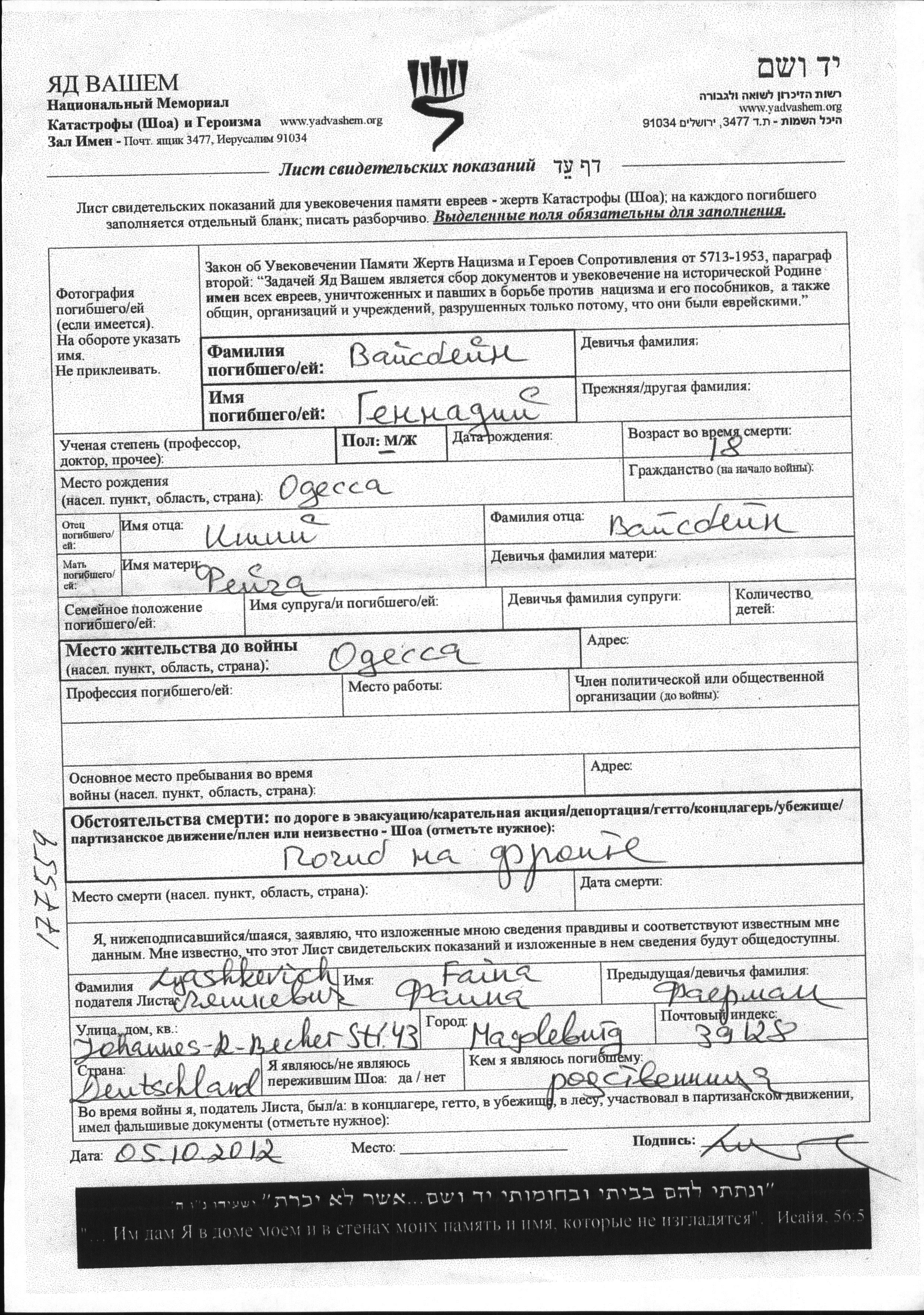 Gennadiy Vaysbeyn wurde in Odessa, Ukraine (UdSSR) geboren. Er war der Sohn von Ishiy und Feyga. Vor dem Zweiten Weltkrieg lebte er in Odessa, Ukraine (UdSSR). Während des Krieges war er in die Sowjetischen Streitkräfte.