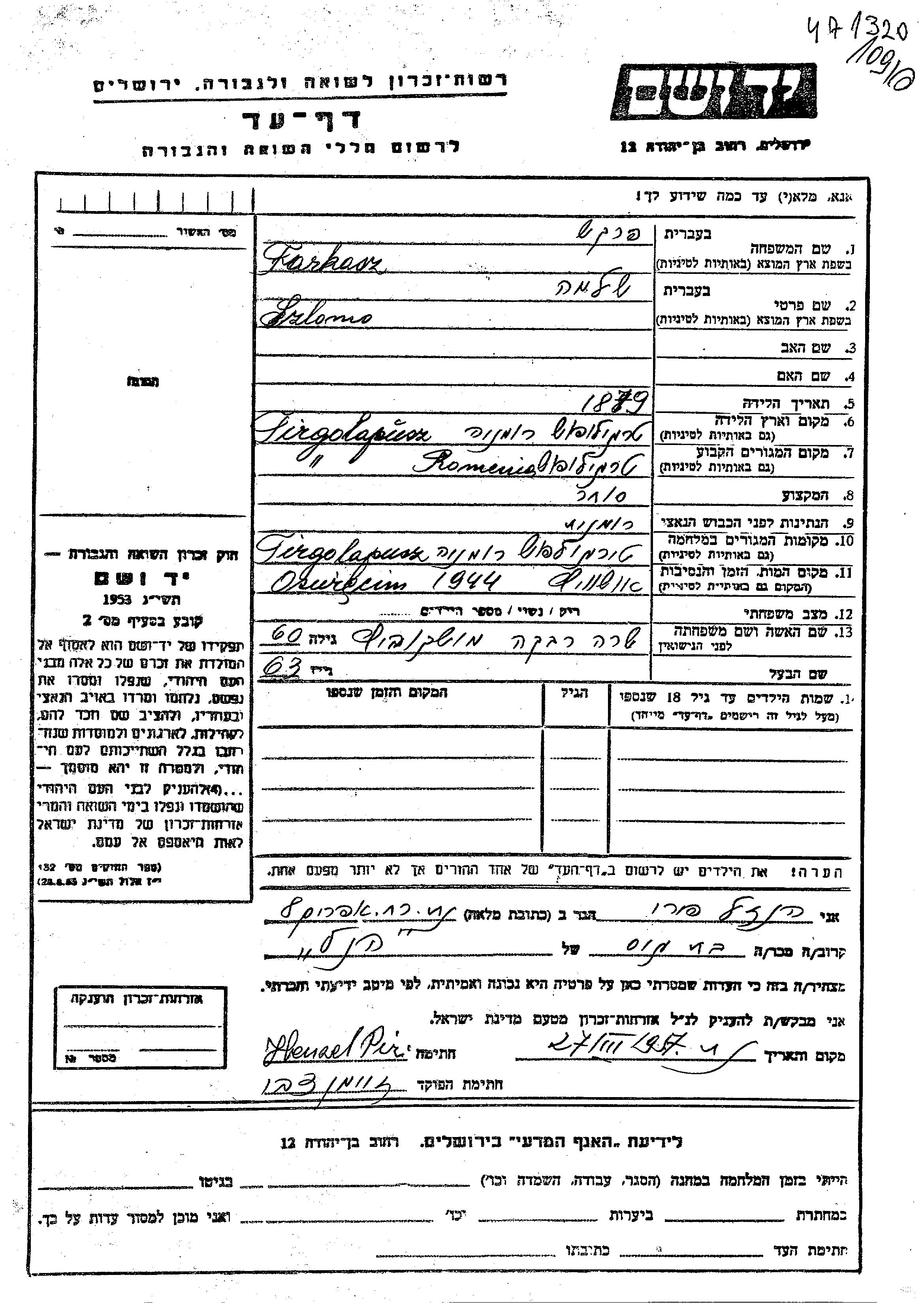 Szlomo Farkasz wurde im Jahr 1889 in Targu Lopus, Rumänien geboren. Er war Kaufmann/-frau und mit Sara Rivka, geb. Moshkovitz Verheiratet. Vor dem Zweiten Weltkrieg lebte er in Targu Lopus, Rumänien. Während des Krieges war er in Targu Lopus, Rumänien.
