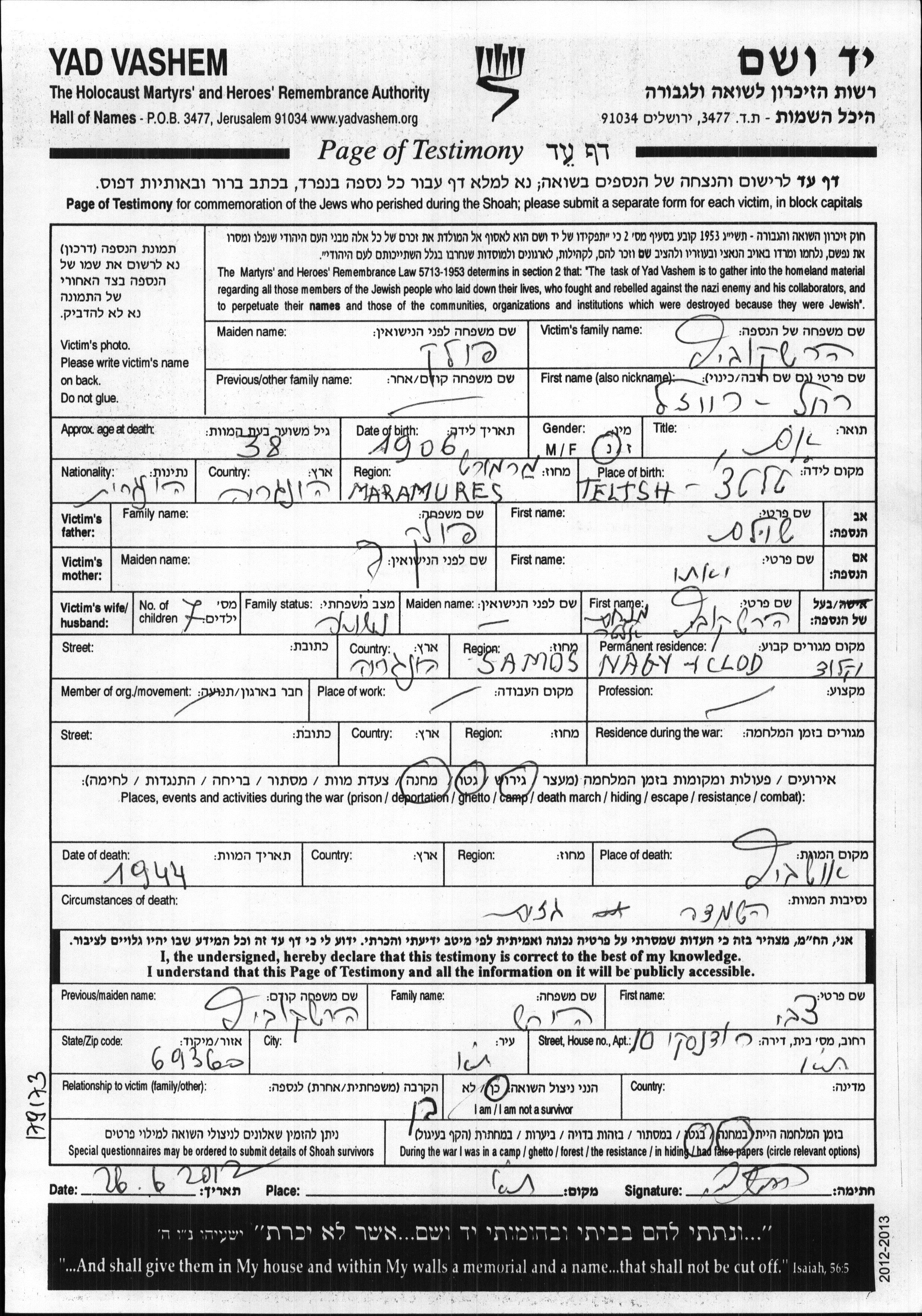Rachel Reizl Hershkovitz, geb. Polak wurde im Jahr 1906 in Teltsch, Rumänien geboren. Sie war die Tochter von Shalom und Yeti. Sie war mit Menakhem Alter Verheiratet. Vor dem Zweiten Weltkrieg lebte sie in Nagykolcs, Rumänien.