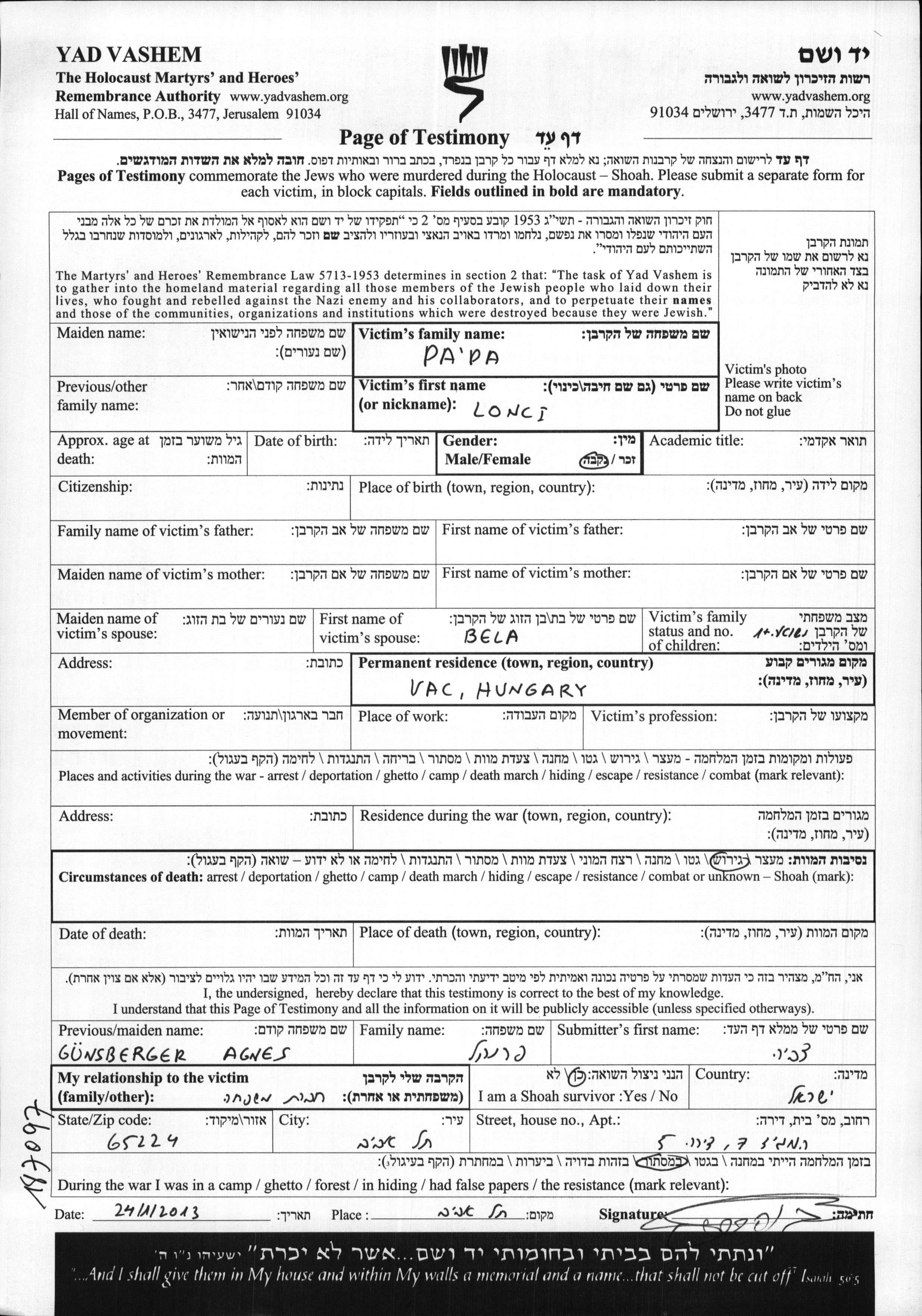 Lonci Papa. Sie war mit Bela Verheiratet. Vor dem Zweiten Weltkrieg lebte sie in Vac, Ungarn. Während des Krieges war sie in Vac, Ungarn.