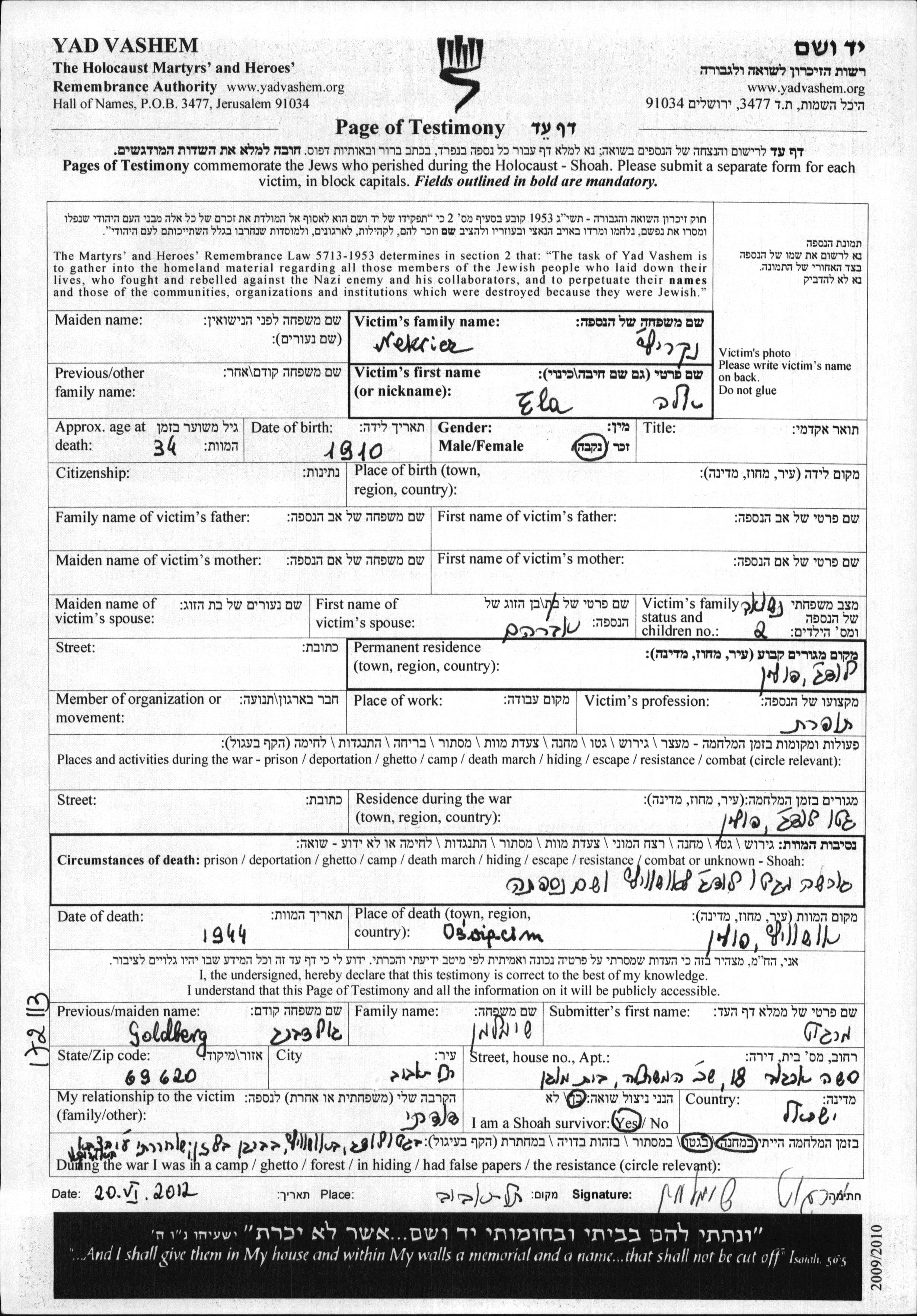 Ela Nekricz wurde im Jahr 1910 geboren. Sie war Schneiderin und mit Avraham Verheiratet. Vor dem Zweiten Weltkrieg lebte sie in Lodz, Polen. Während des Krieges war sie in Lodz, Polen.