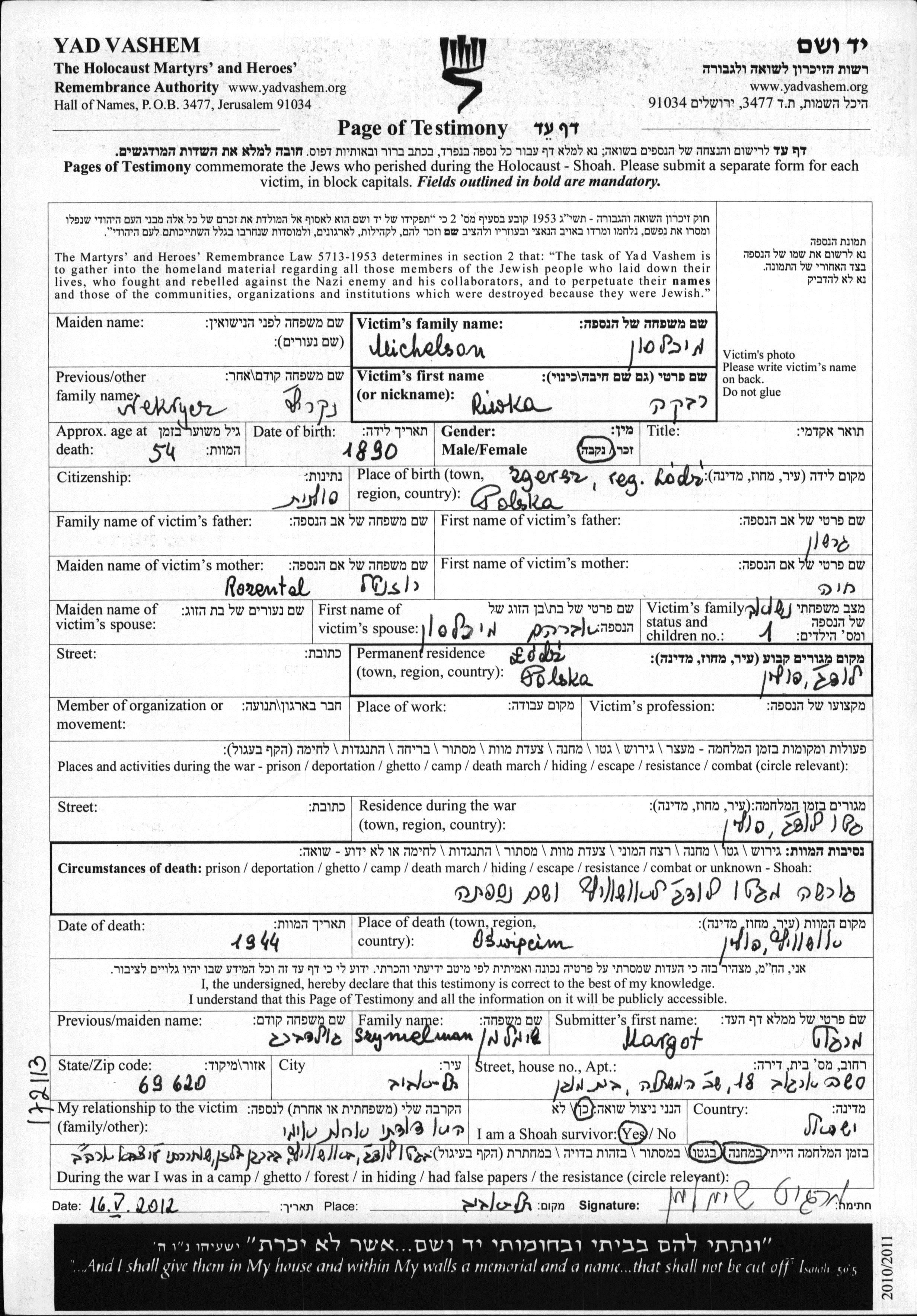 Riwka Michelson Nekrycz wurde im Jahr 1890 in Zgerzh, Polen geboren. Sie war die Tochter von Gershon und Chaia, geb. Rozental. Sie war mit Avraham Verheiratet. Vor dem Zweiten Weltkrieg lebte sie in Lodz, Polen. Während des Krieges war sie in Lodz, Polen.