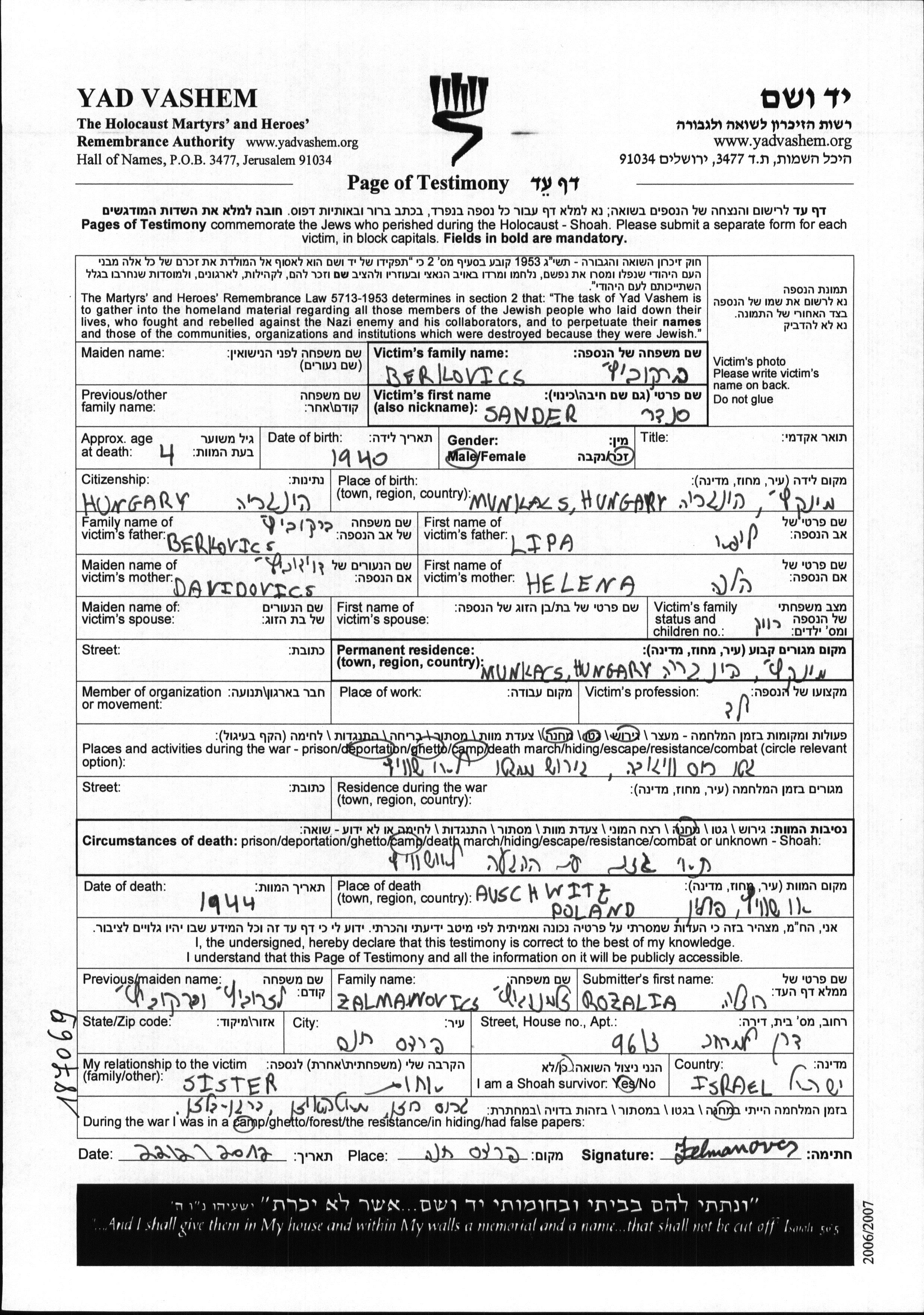 Sander Berkovics wurde im Jahr 1940 in Munkacs, Tschechoslowakei geboren. Er war der Sohn von Lipa und Helena, geb. Davidovics. Er war Kind. Vor dem Zweiten Weltkrieg lebte er in Munkacs, Tschechoslowakei. Während des Krieges war er in Getto.