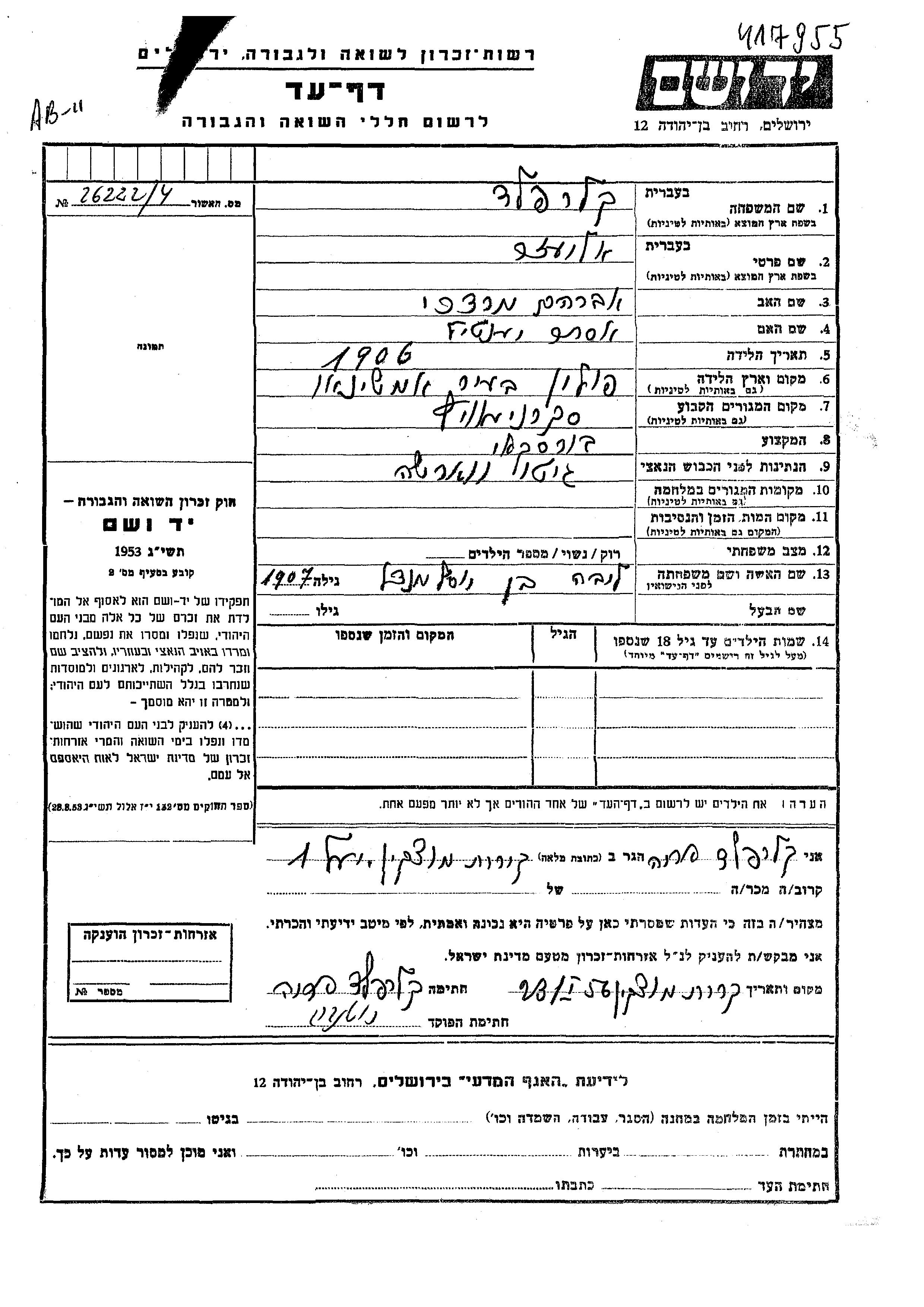 Eliezer Krefeld wurde im Jahr 1906 in Amszczonow, Polen geboren. Er war der Sohn von Avraham Mordekhai und Ester Yenta. Er war Gerber und mit Liba, geb. Mandel Verheiratet. Vor dem Zweiten Weltkrieg lebte er in Skierniewice, Polen. Während des Krieges war er in Warsaw, Polen.