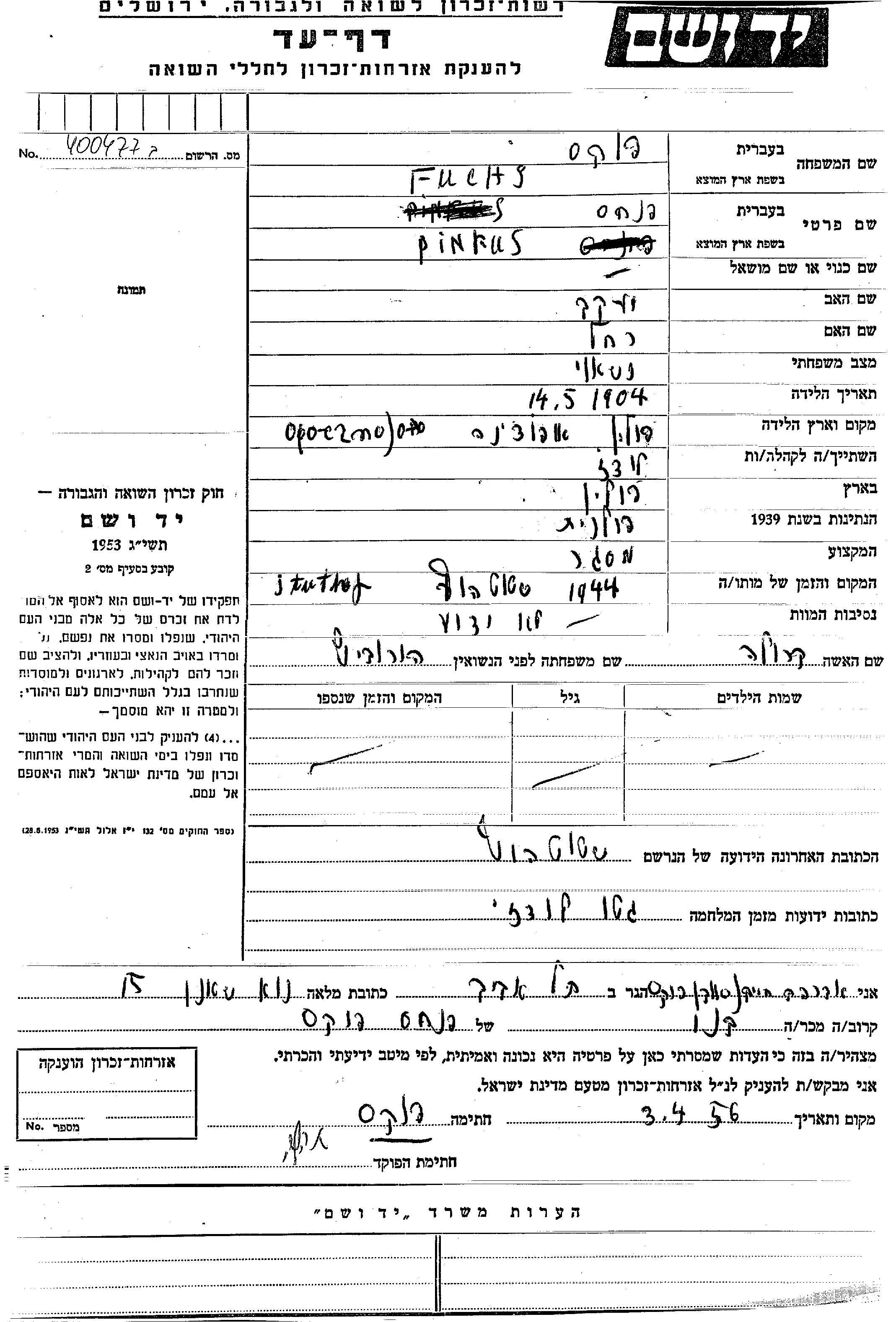 Pinkhas Fuchs wurde im Jahr 1904 in Opoczno, Polen geboren. Er war der Sohn von Yaakov und Rakhel. Er war Schlosser und mit Karola, geb. Horovitz Verheiratet. Vor dem Zweiten Weltkrieg lebte er in Stutthof, Freie Stadt Danzig. Während des Krieges war er in Lodz, Polen.