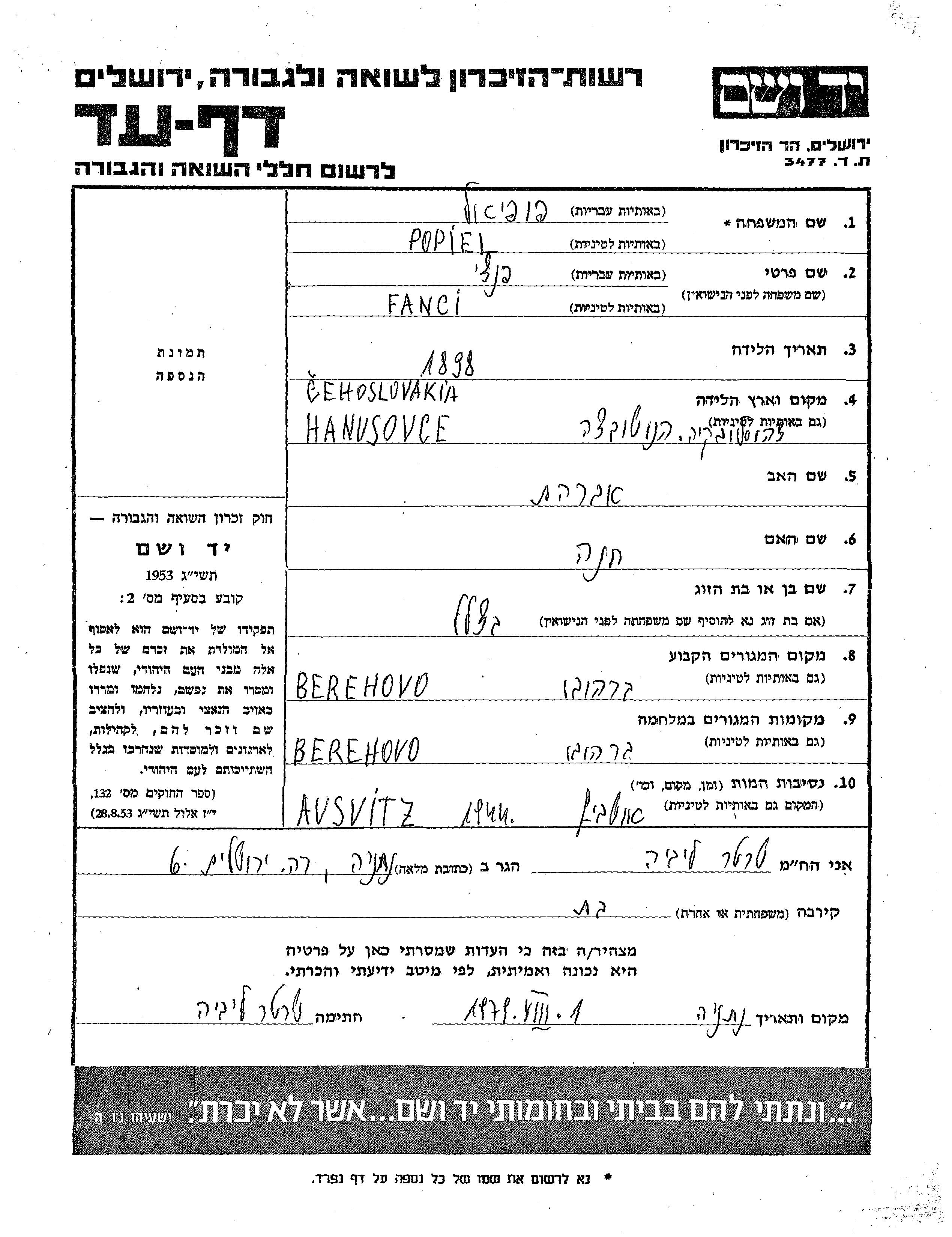 Fanci Popiel wurde im Jahr 1898 in Hanusovce, Tschechoslowakei geboren. Sie war die Tochter von Avraham und Khana. Sie war mit Betzalel Verheiratet. Vor dem Zweiten Weltkrieg lebte sie in Berehovo, Tschechoslowakei. Während des Krieges war sie in Berehovo, Tschechoslowakei.