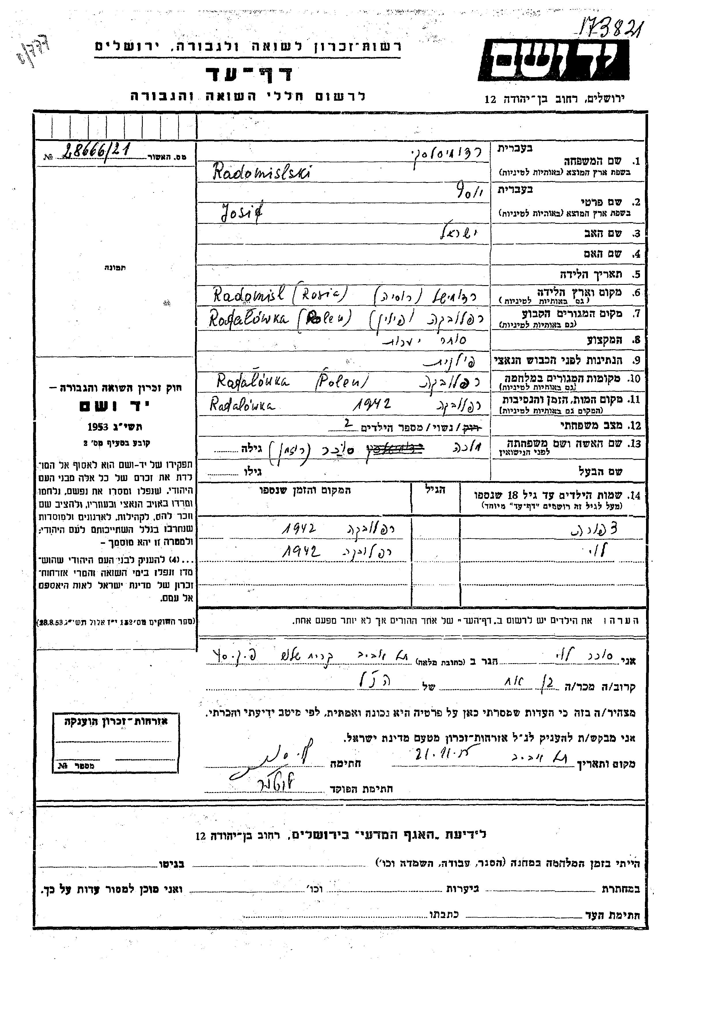 Josif Radomiselski wurde in Radomishel, Ukraine (UdSSR) geboren. Er war der Sohn von Yisrael. Er war Waldhändler und mit Malka, geb. Sukher Verheiratet. Vor dem Zweiten Weltkrieg lebte er in Rafałówka, Polen. Während des Krieges war er in Rafałówka, Polen.