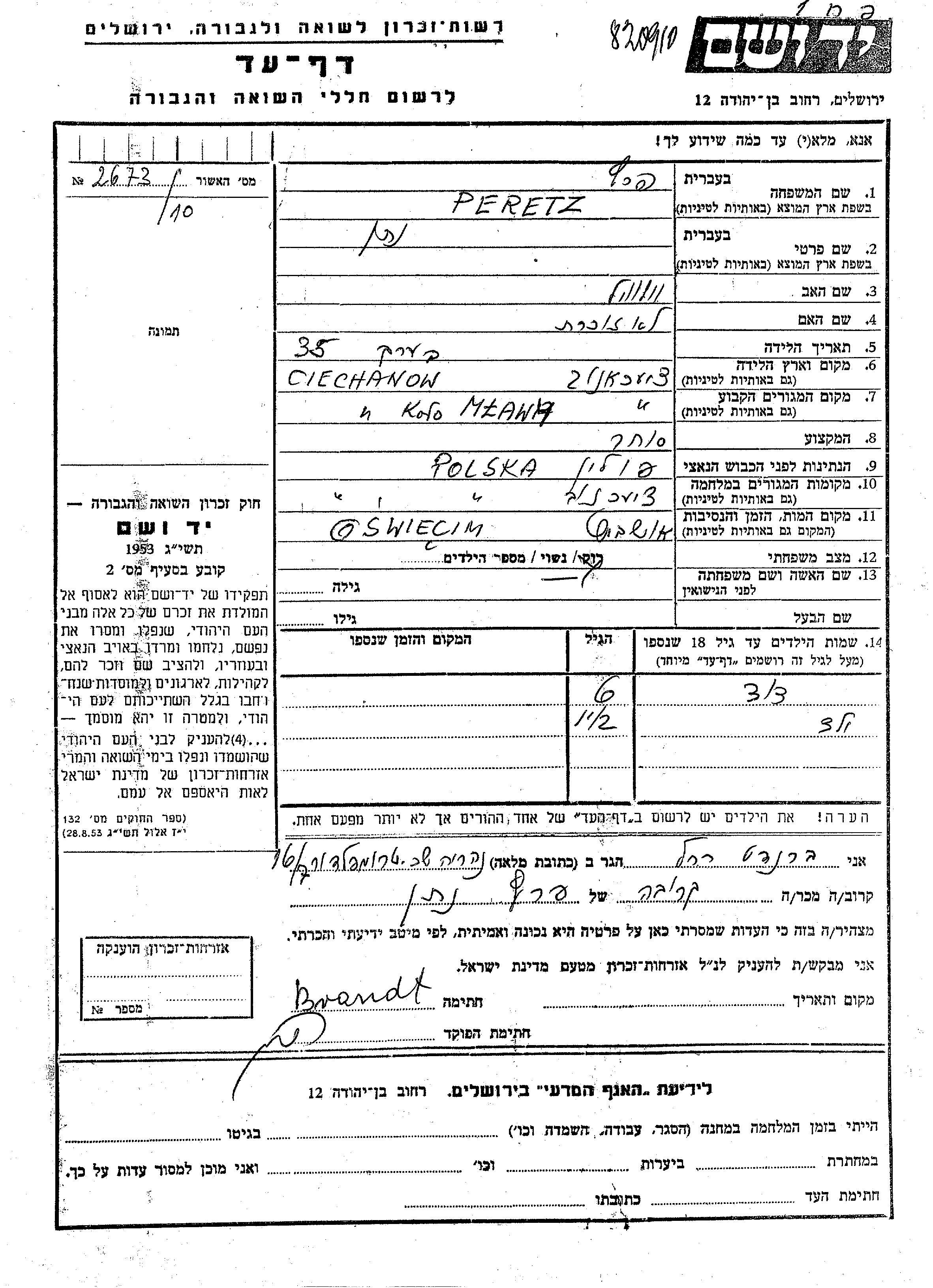 Natan Peretz wurde in Ciechanow, Polen geboren. Er war der Sohn von Volf. Er war Kaufmann/-frau und Verheiratet. Vor dem Zweiten Weltkrieg lebte er in Ciechanow, Polen. Während des Krieges war er in Ciechanow, Polen.
