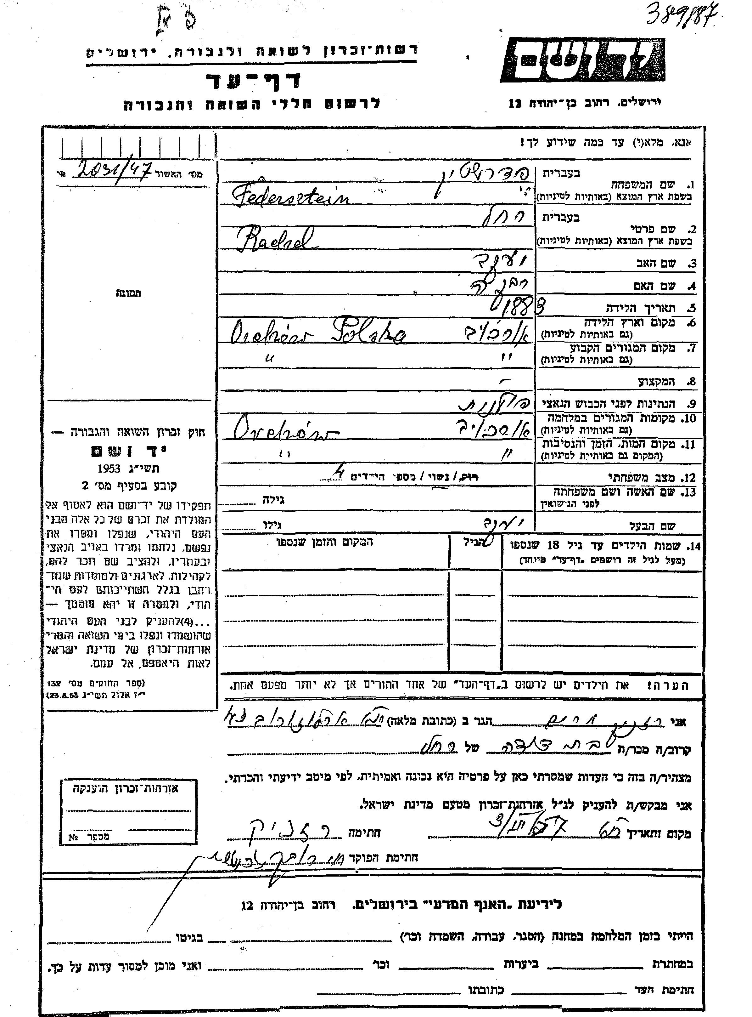 Rachel Federstein wurde im Jahr 1883 in Orchow, Polen geboren. Sie war die Tochter von Yaakov und Rivka. Sie war mit Yaakov Verheiratet. Vor dem Zweiten Weltkrieg lebte sie in Orchow, Polen. Während des Krieges war sie in Orchow, Polen.