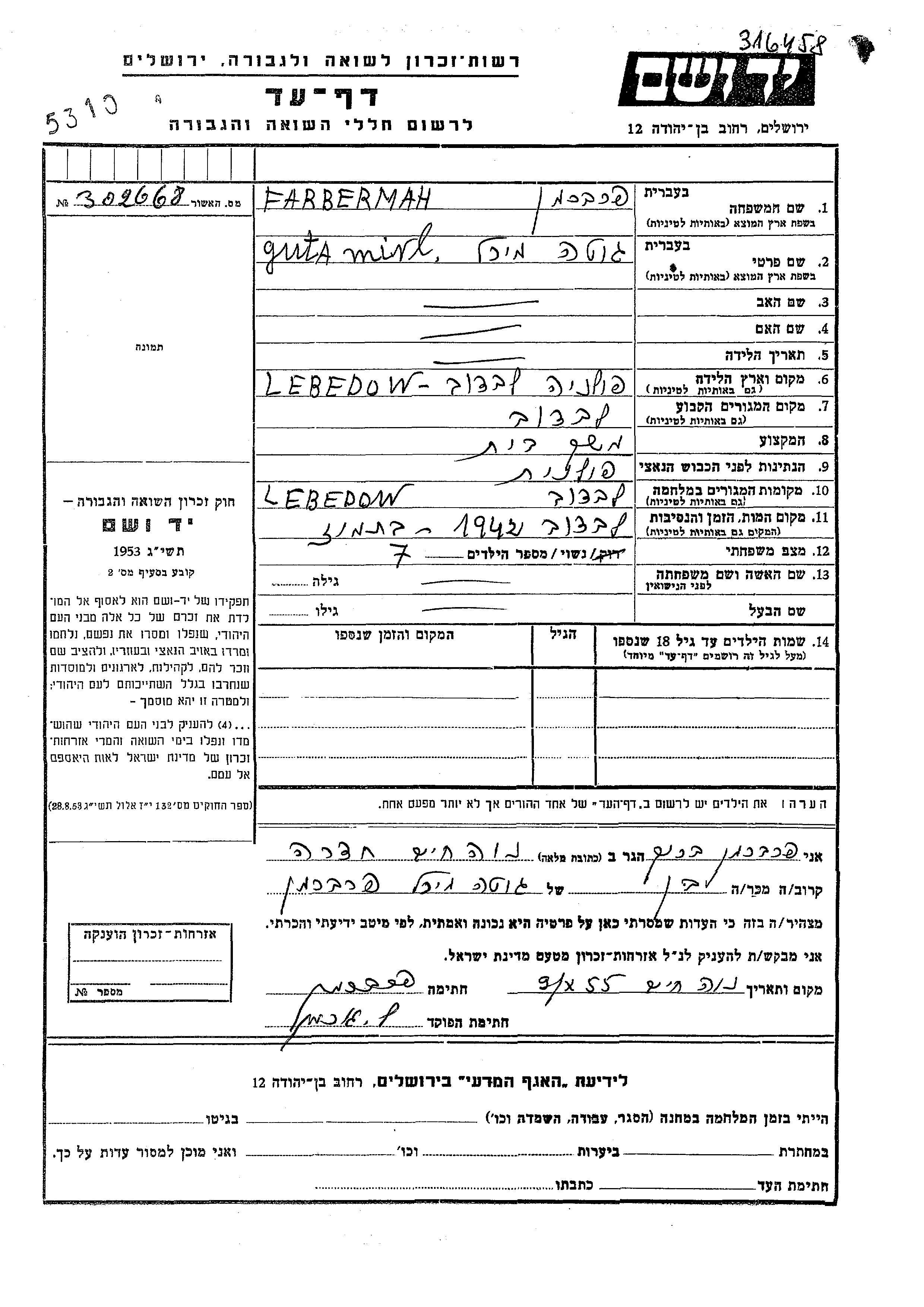 Mirl Guta Farberman wurde in Lebedowa, Polen geboren. Sie war Haushaltshilfe und Verheiratet. Vor dem Zweiten Weltkrieg lebte sie in Lebedowa, Polen. Während des Krieges war sie in Lebedowa, Polen.