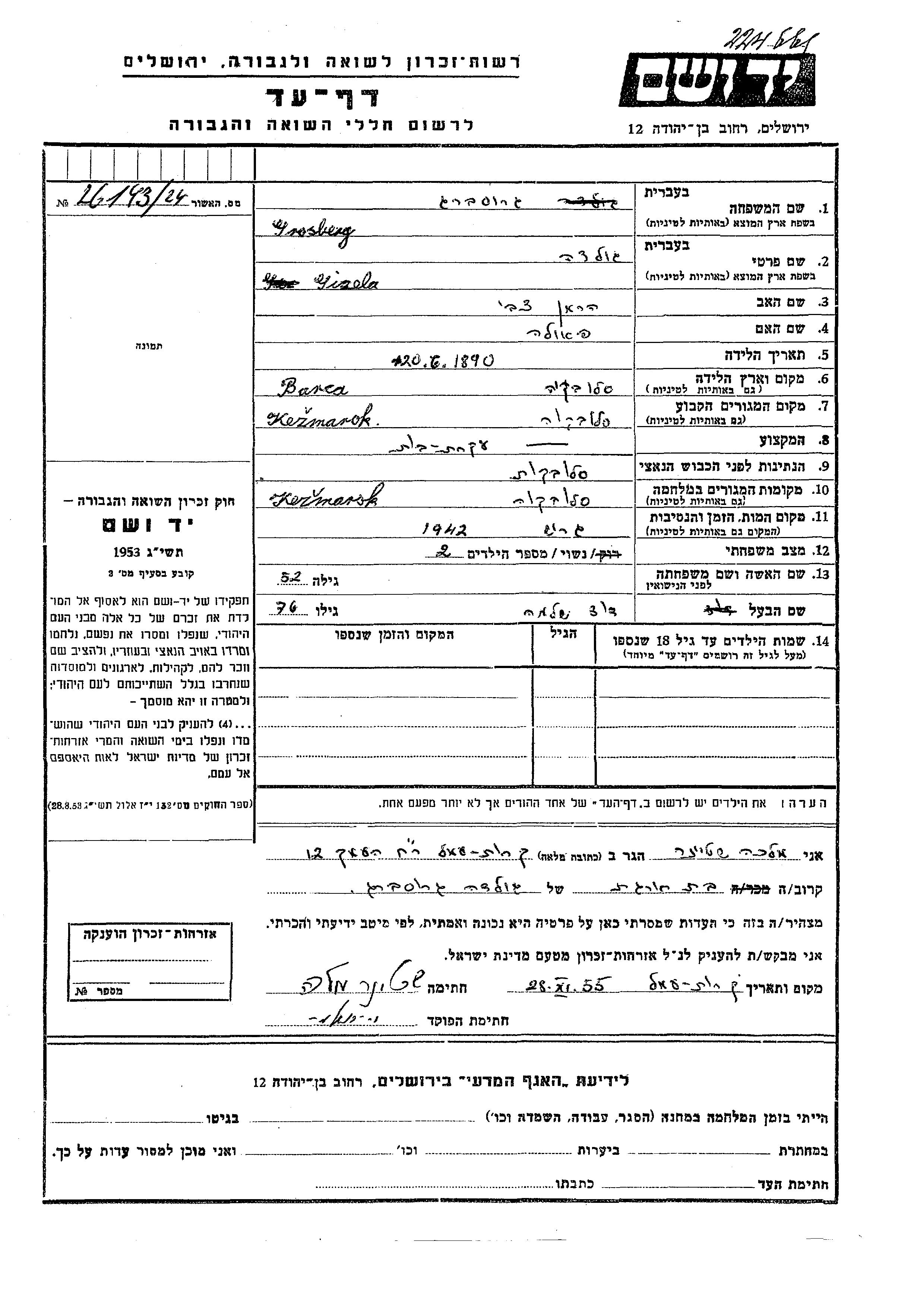 Gizela Golda Grosberg wurde im Jahr 1890 in Barca, Tschechoslowakei geboren. Sie war die Tochter von Herman Tzvi und Paula. Sie war Hausfrau und mit David Shlomo Verheiratet. Vor dem Zweiten Weltkrieg lebte sie in Kezmarok, Tschechoslowakei. Während des Krieges war sie in Kezmarok, Tschechoslowakei.