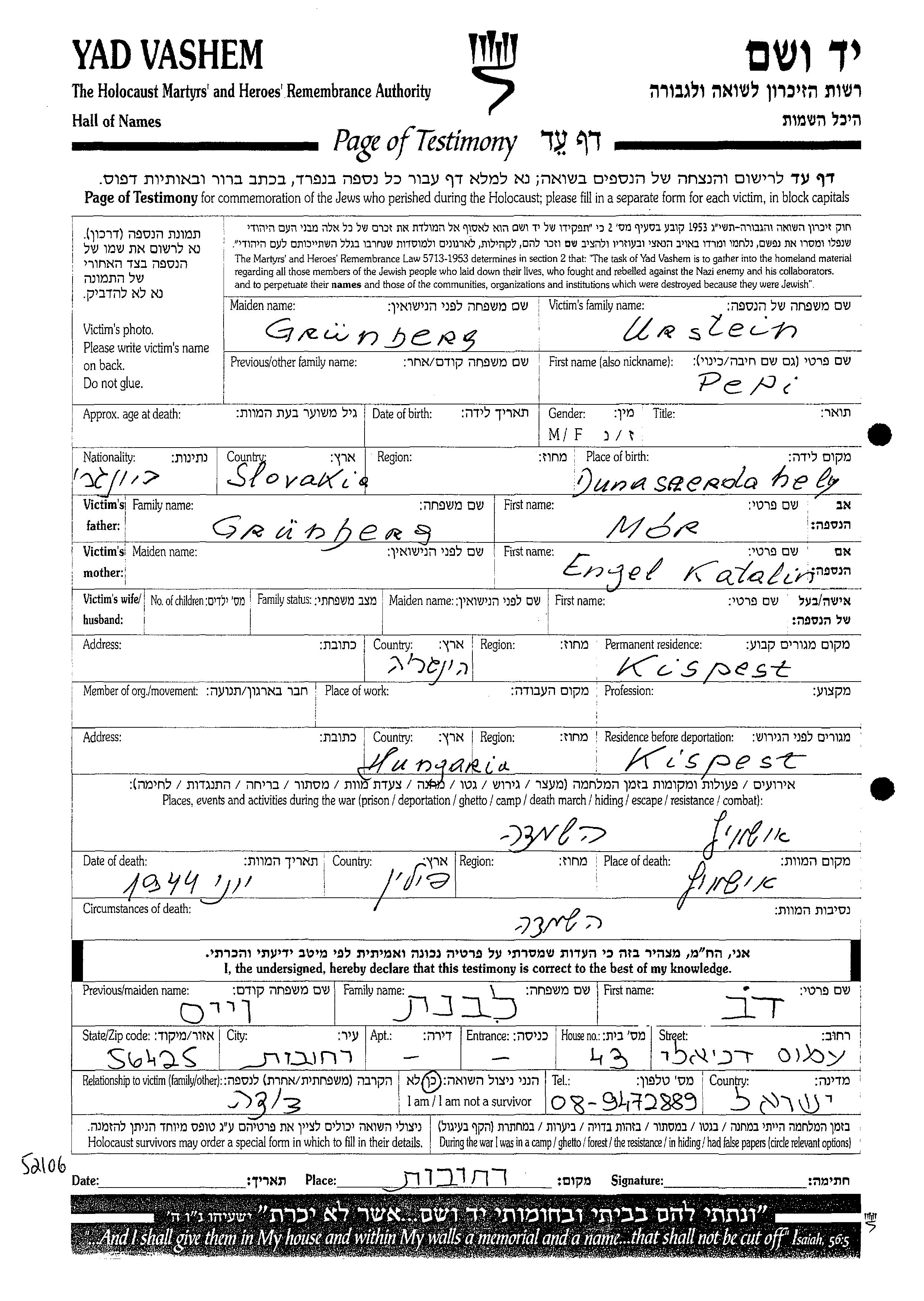 Pepi Urstein, geb. Grunberg wurde in Dunaszerdahely, Tschechoslowakei geboren. Sie war die Tochter von Mor und Katalin Engel. Sie war Verheiratet. Vor dem Zweiten Weltkrieg lebte sie in Kispest, Ungarn. Während des Krieges war sie in Kispest, Ungarn.