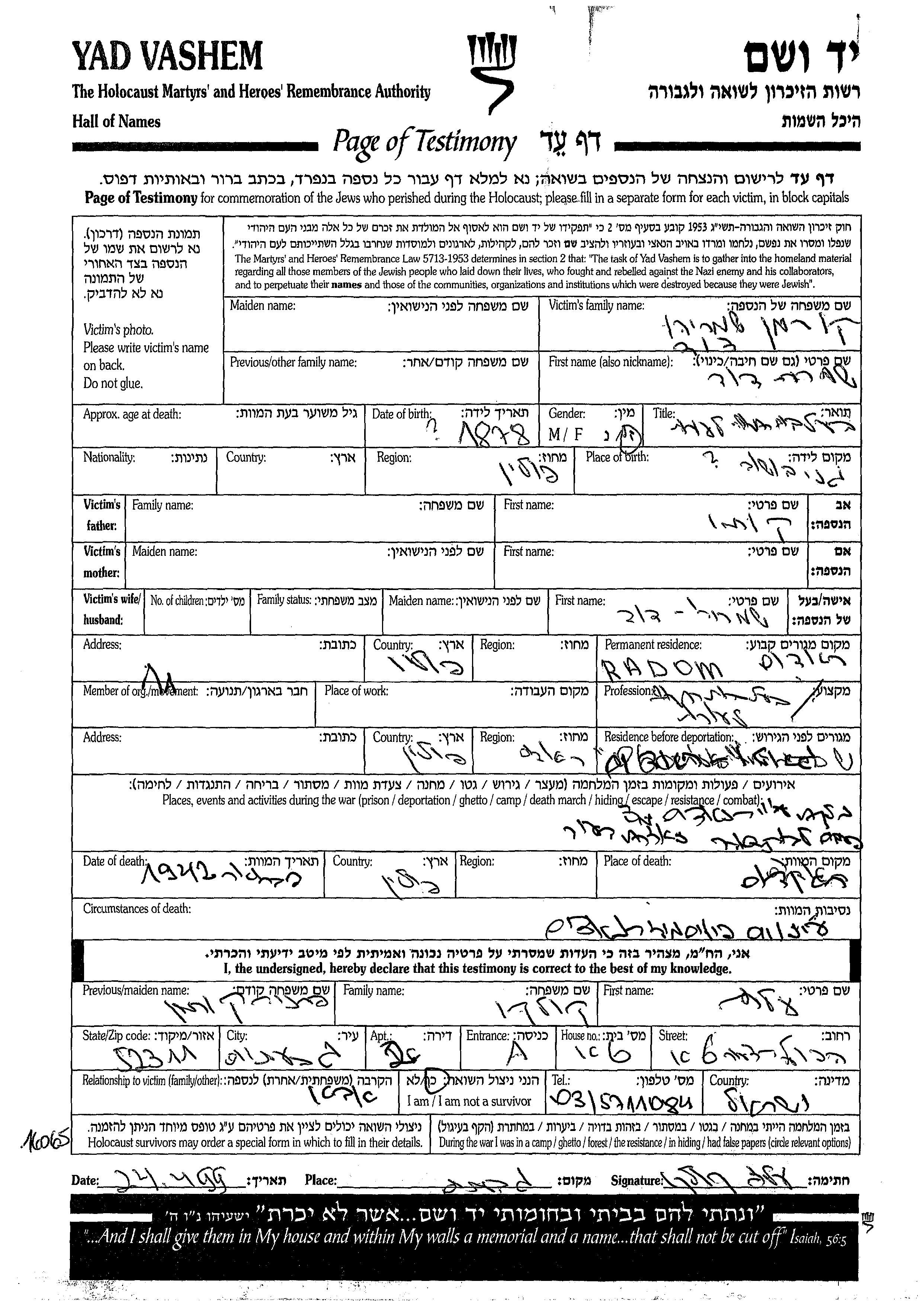 Shmariahu David wurde in der Schoah ermordet. Todesort: Radom, Polen im Jahr 02/1942.
