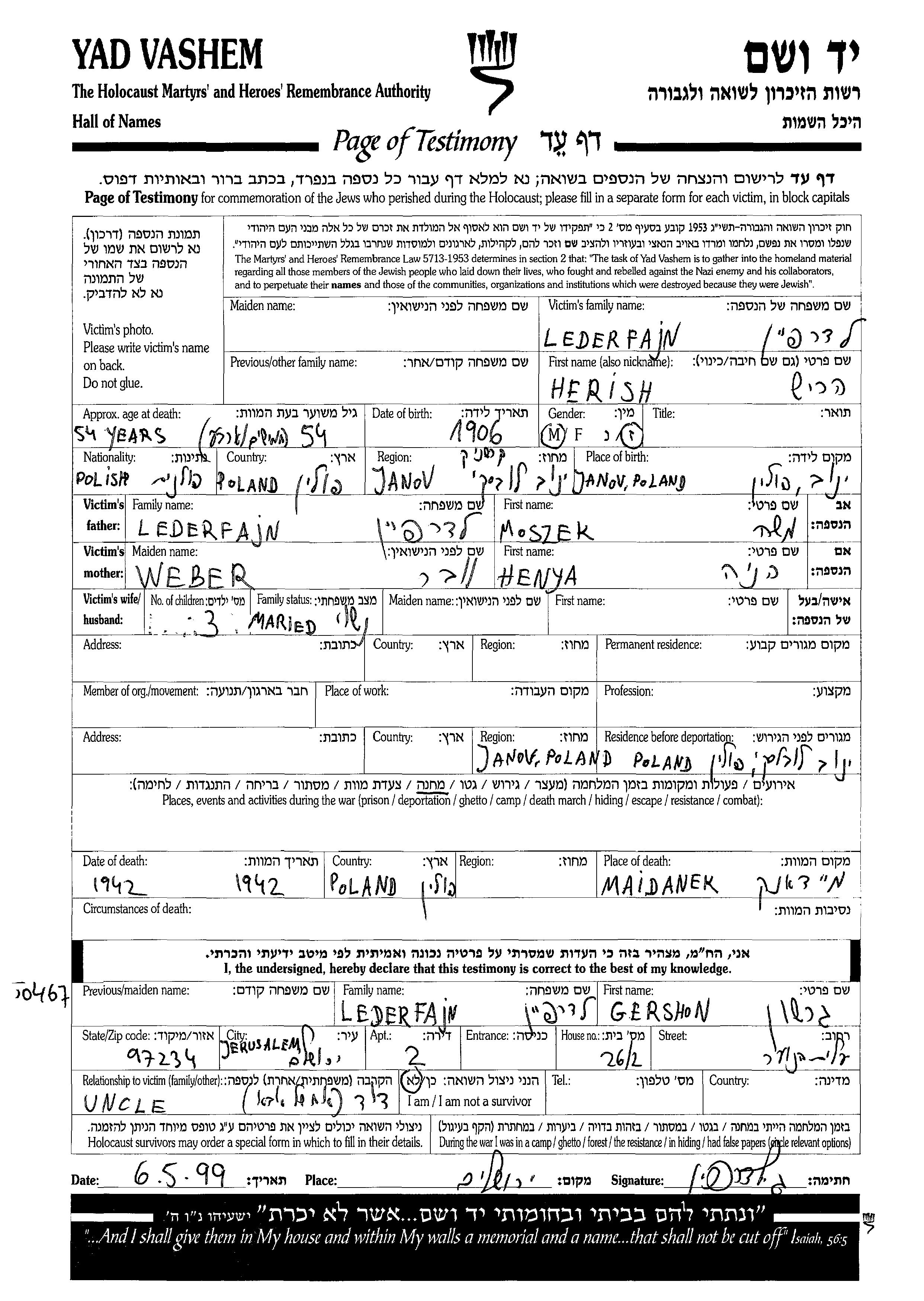 Herish Lederfajn wurde im Jahr 1906 in Janov, Polen geboren. Er war der Sohn von Moszek und Henya Henia. Er war Verheiratet. Während des Krieges war er in Janov, Polen.