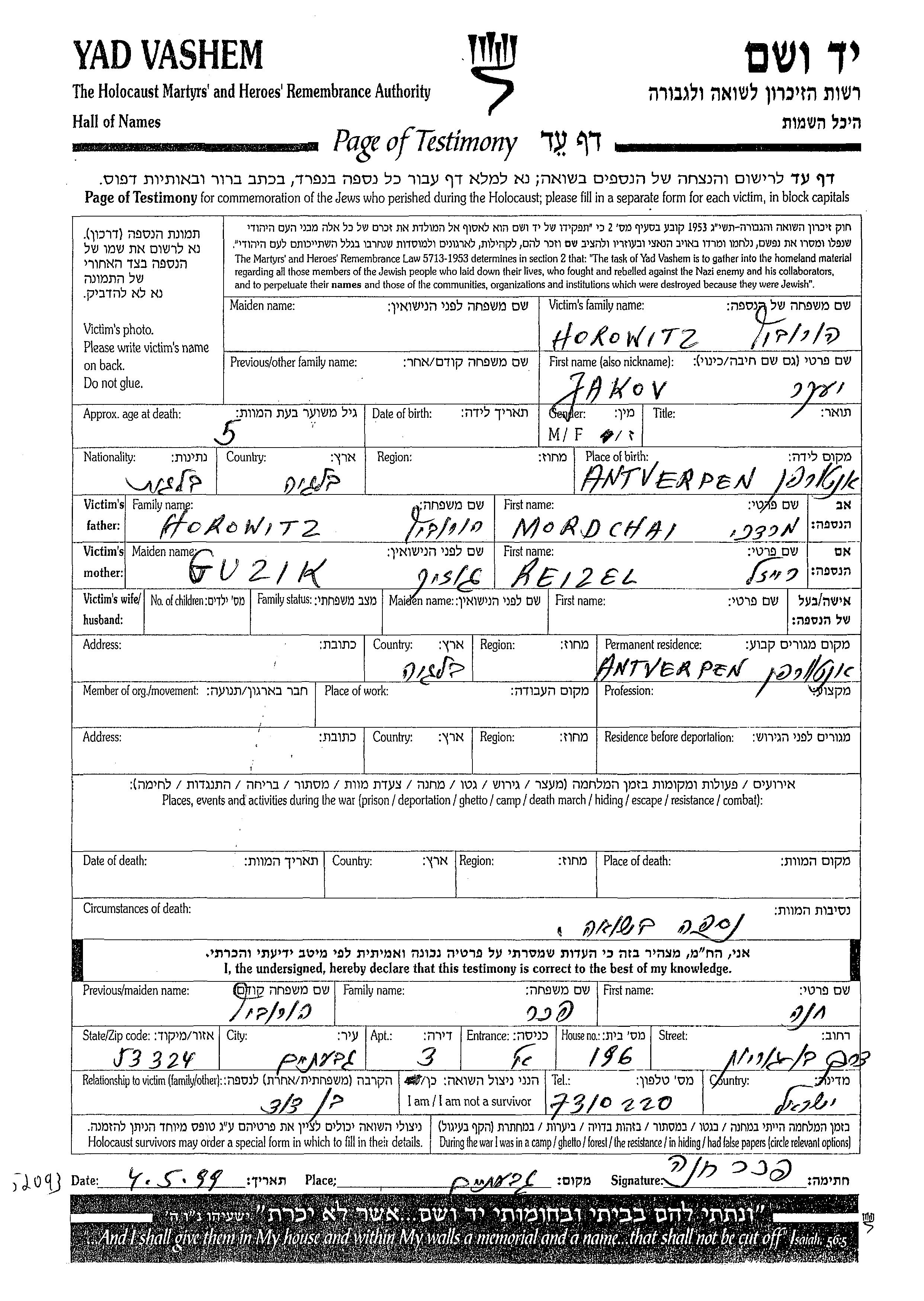 Horowitz Jakov Antverpen, Belgien Gedenkblatt