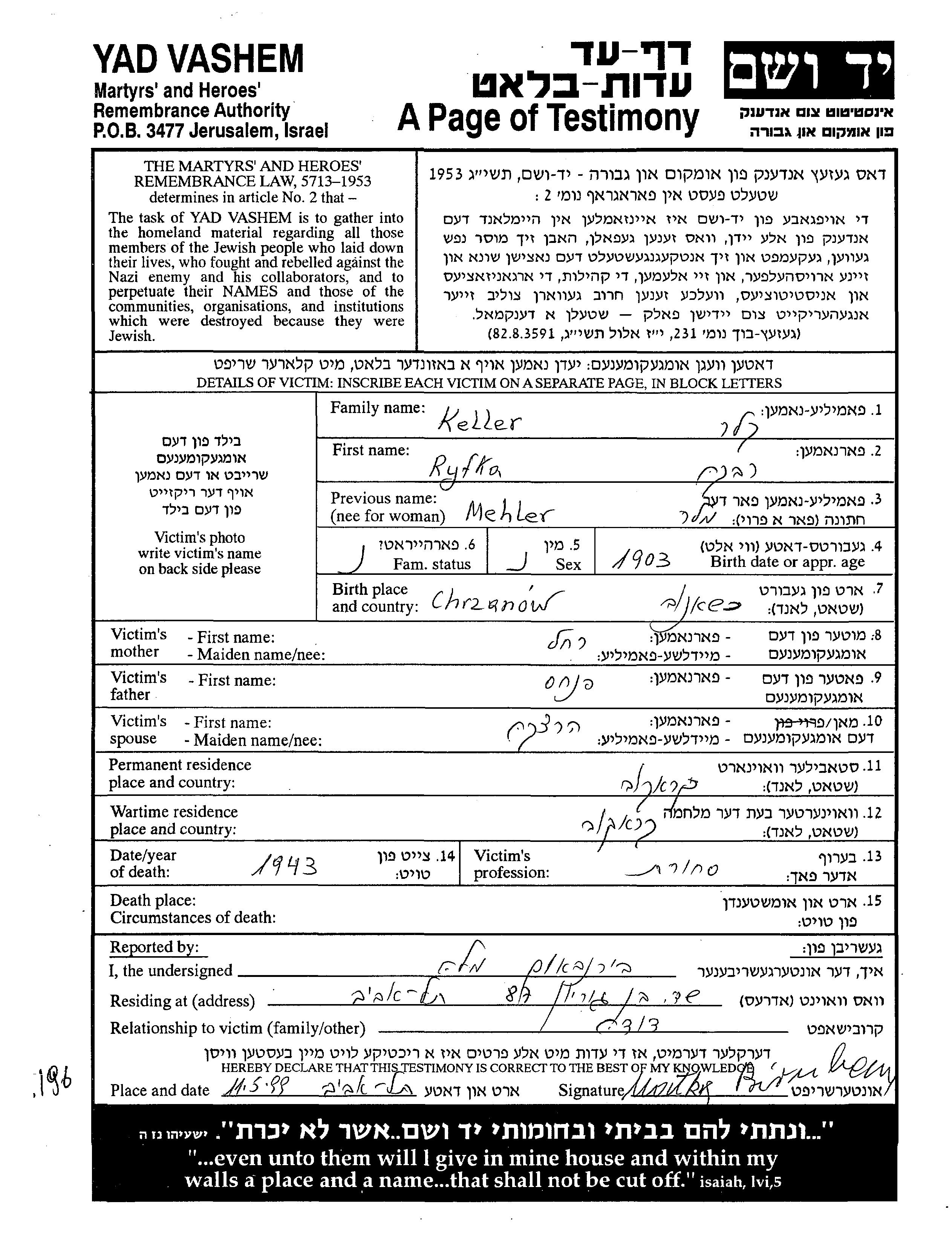 Ryfka Keller, geb. Mehler Maler wurde im Jahr 1903 in Chrzanow, Polen geboren. Sie war die Tochter von Pinkhas und Rakhel. Sie war Kaufmann/-frau und mit Hertzka Verheiratet. Vor dem Zweiten Weltkrieg lebte sie in Krakow, Polen. Während des Krieges war sie in Krakow, Polen.