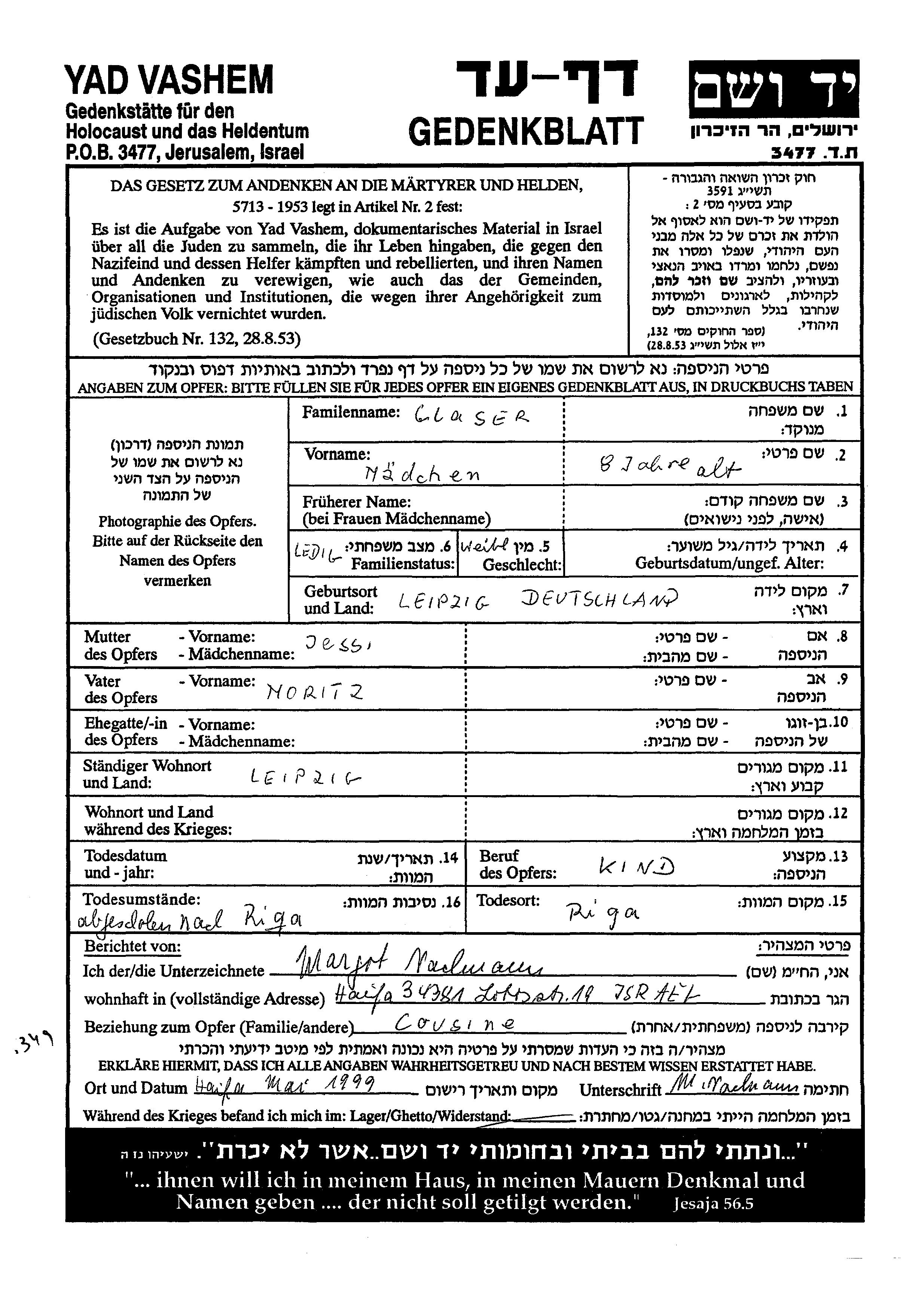 Madchen wurde in der Schoah ermordet. Todesort: Riga, Lettland.
