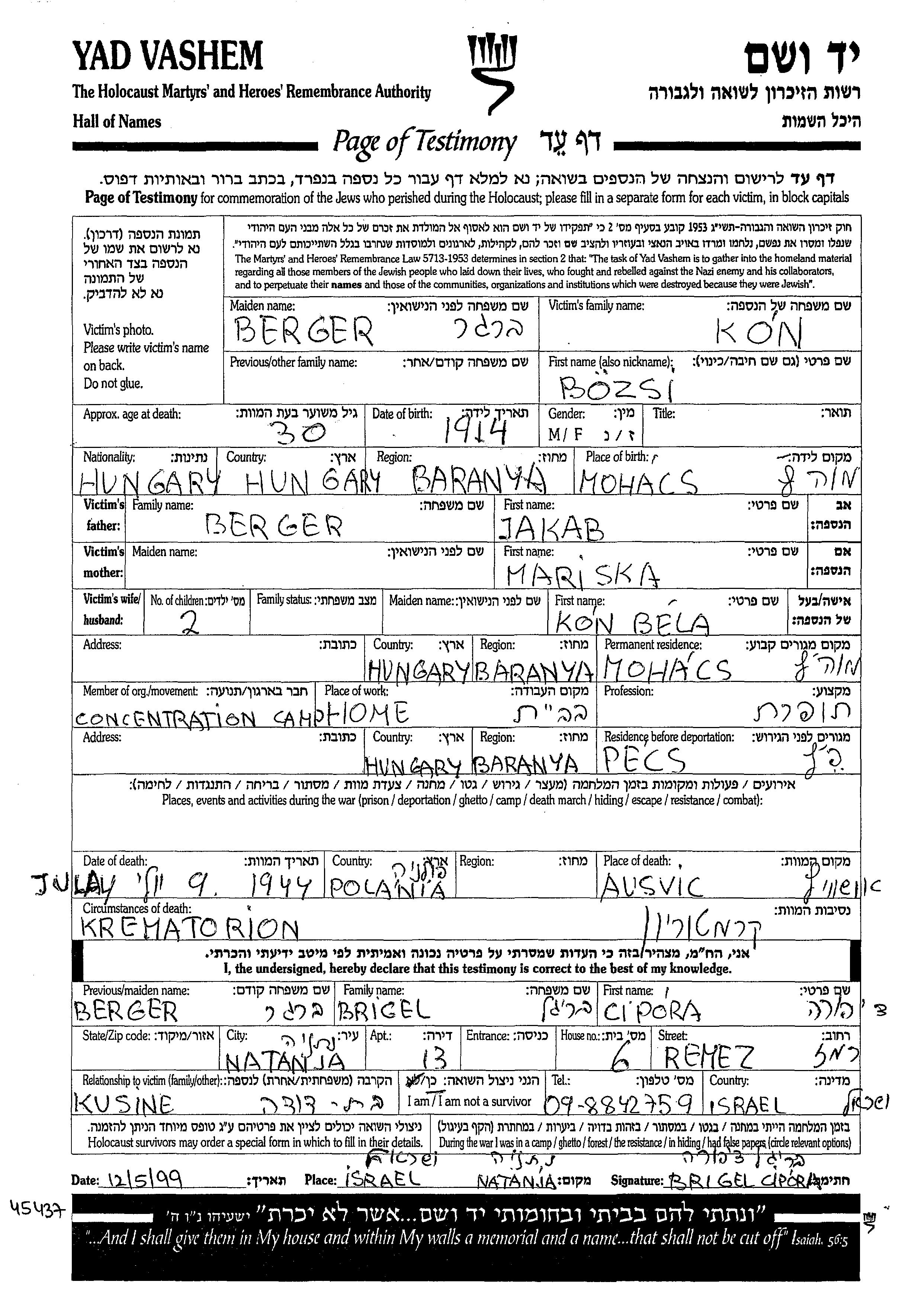 Bozsi Kon, geb. Berger wurde im Jahr 1914 in Mohacs, Ungarn geboren. Sie war die Tochter von Jakab und Mariska. Sie war Schneiderin. Vor dem Zweiten Weltkrieg lebte sie in Mohacs, Ungarn. Während des Krieges war sie in Pecs, Ungarn.