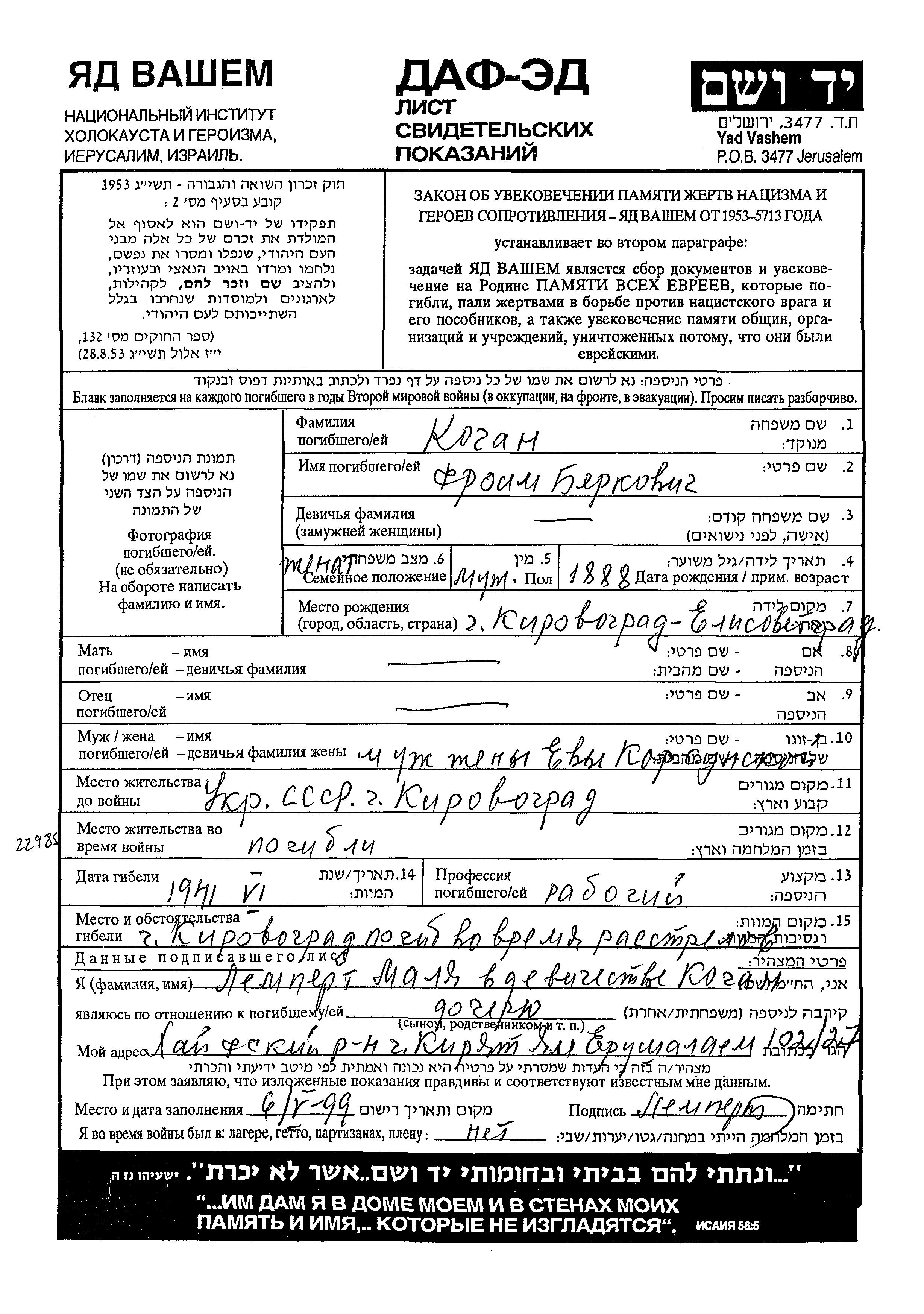 Froim Kogan wurde im Jahr 1888 in Kirovograd, Ukraine (UdSSR) geboren. Er war der Sohn von Berk. Er war Arbeiter/-in und mit Eva, geb. Korsunskaya Verheiratet. Vor dem Zweiten Weltkrieg lebte er in Kirovograd, Ukraine (UdSSR). Während des Krieges war er in Kirovograd, Ukraine (UdSSR).