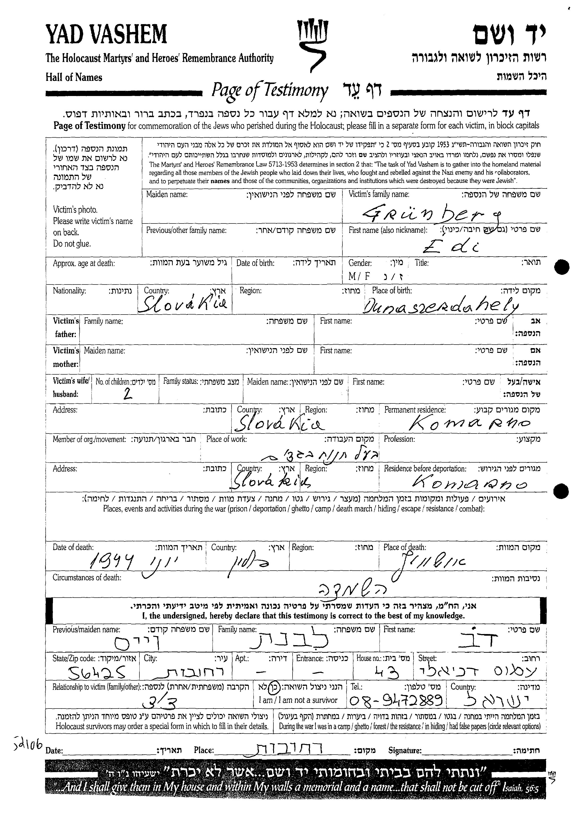 Edi Grunberg wurde in Dunaszerdahely, Tschechoslowakei geboren. Er war Besitzer eines bekleidungsgeschäfts und Verheiratet. Vor dem Zweiten Weltkrieg lebte er in Komarno, Tschechoslowakei. Während des Krieges war er in Komarno, Tschechoslowakei.