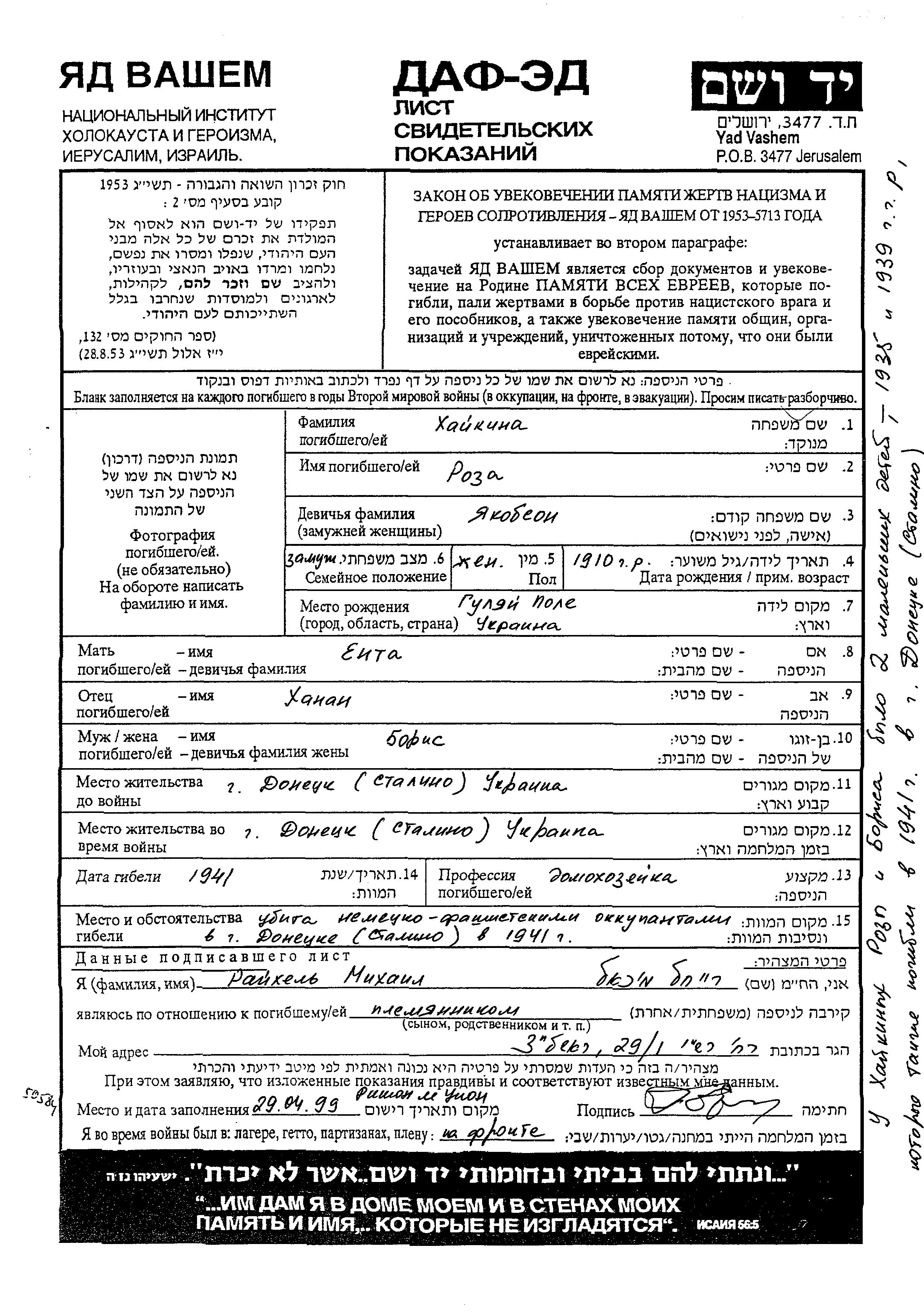Roza Kheikin, geb. Yakobson wurde im Jahr 1910 in Gulyay Pole, Ukraine (UdSSR) geboren. Sie war die Tochter von Khanan und Enta. Sie war Hausfrau und mit Boris Verheiratet. Vor dem Zweiten Weltkrieg lebte sie in Donetsk, Ukraine (UdSSR). Während des Krieges war sie in Donetsk, Ukraine (UdSSR).