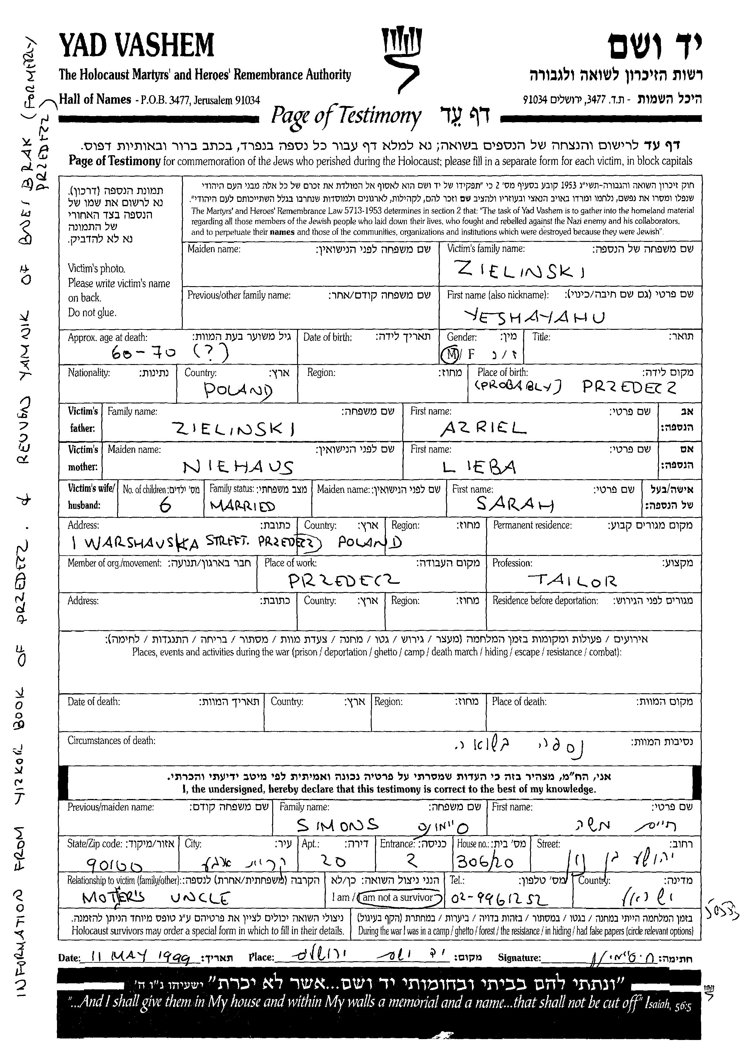 Yeshayahu Zielinski wurde in Przedecz, Polen geboren. Er war der Sohn von Azriel und Lieba. Er war Schneider und mit Sarah Verheiratet. Vor dem Zweiten Weltkrieg lebte er in Przedecz, Polen.