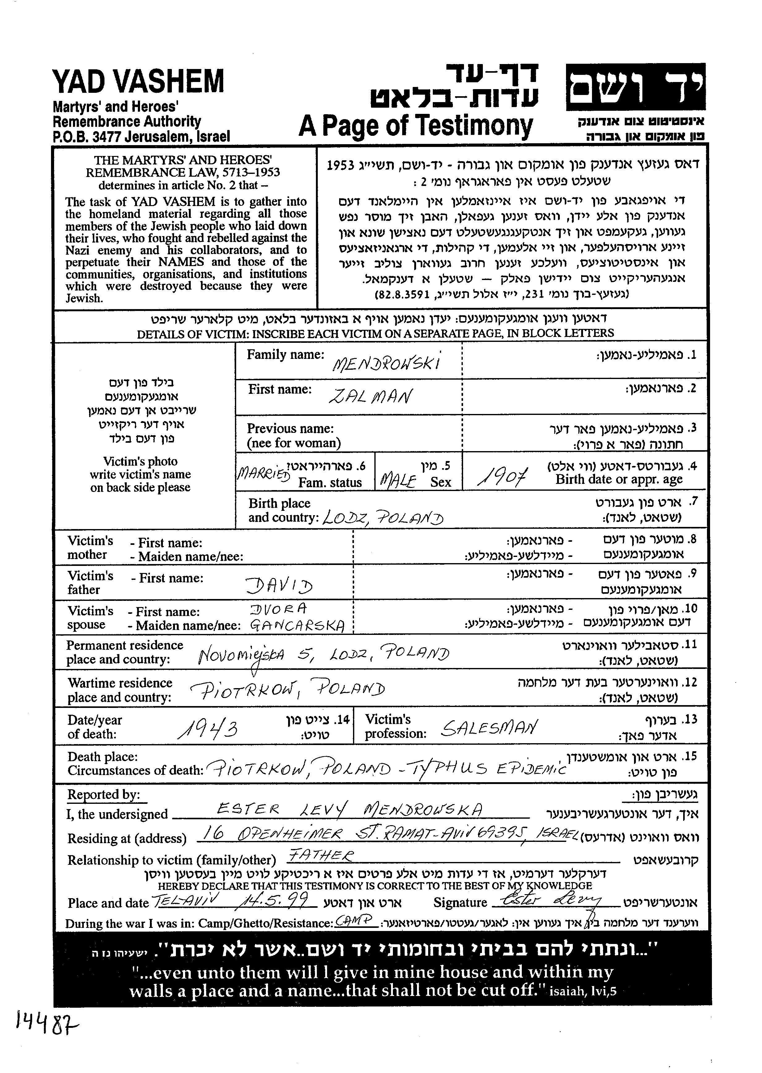 Zalman Mendrowski wurde im Jahr 1907 in Lodz, Polen geboren. Er war der Sohn von David. Er war mit Dvora, geb. Gancarska Verheiratet. Vor dem Zweiten Weltkrieg lebte er in Lodz, Polen. Während des Krieges war er in Piotrkow, Polen.
