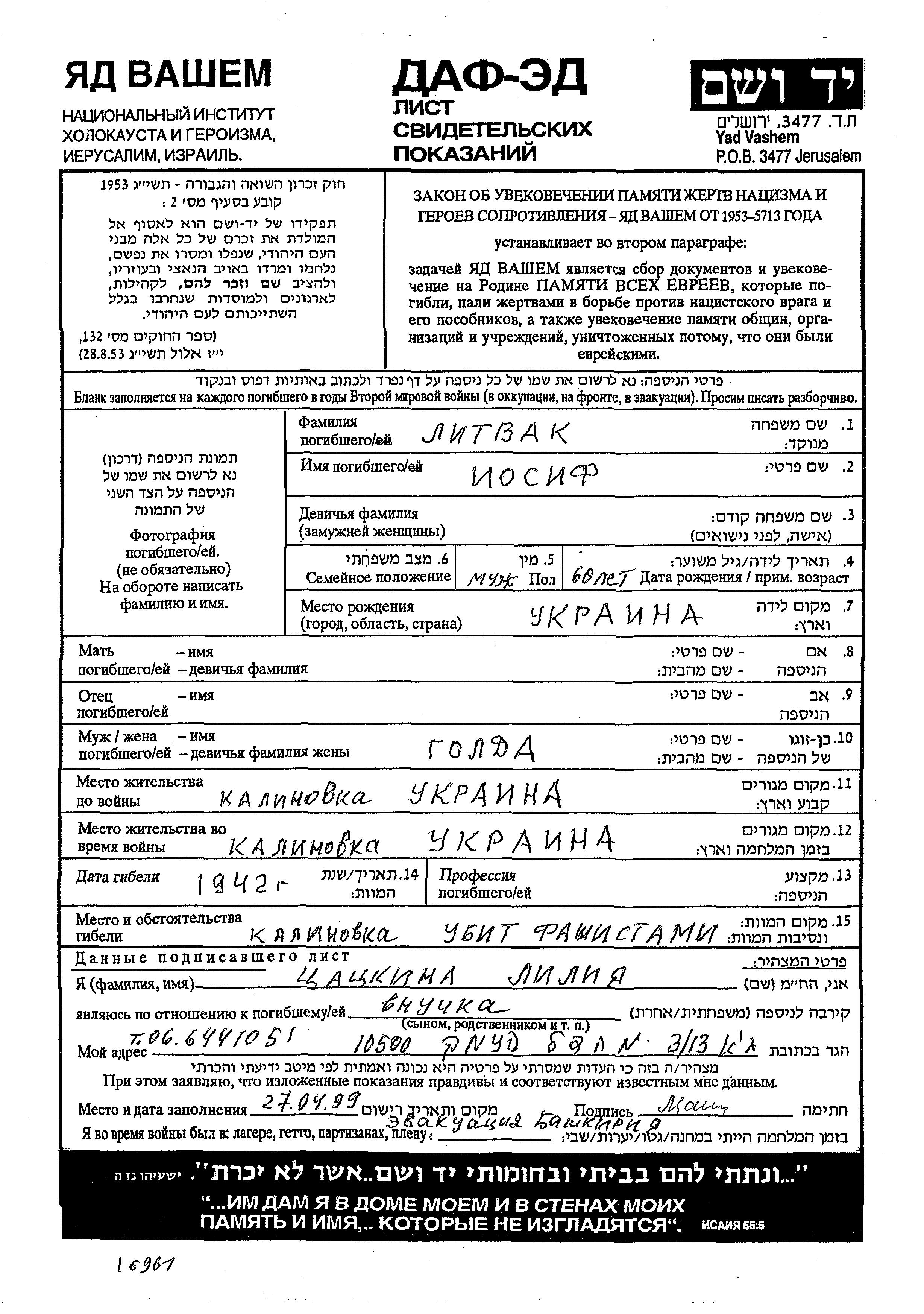 Iosif wurde in der Schoah ermordet. Todesort: Kalinovka, Ukraine (UdSSR) im Jahr 1942.