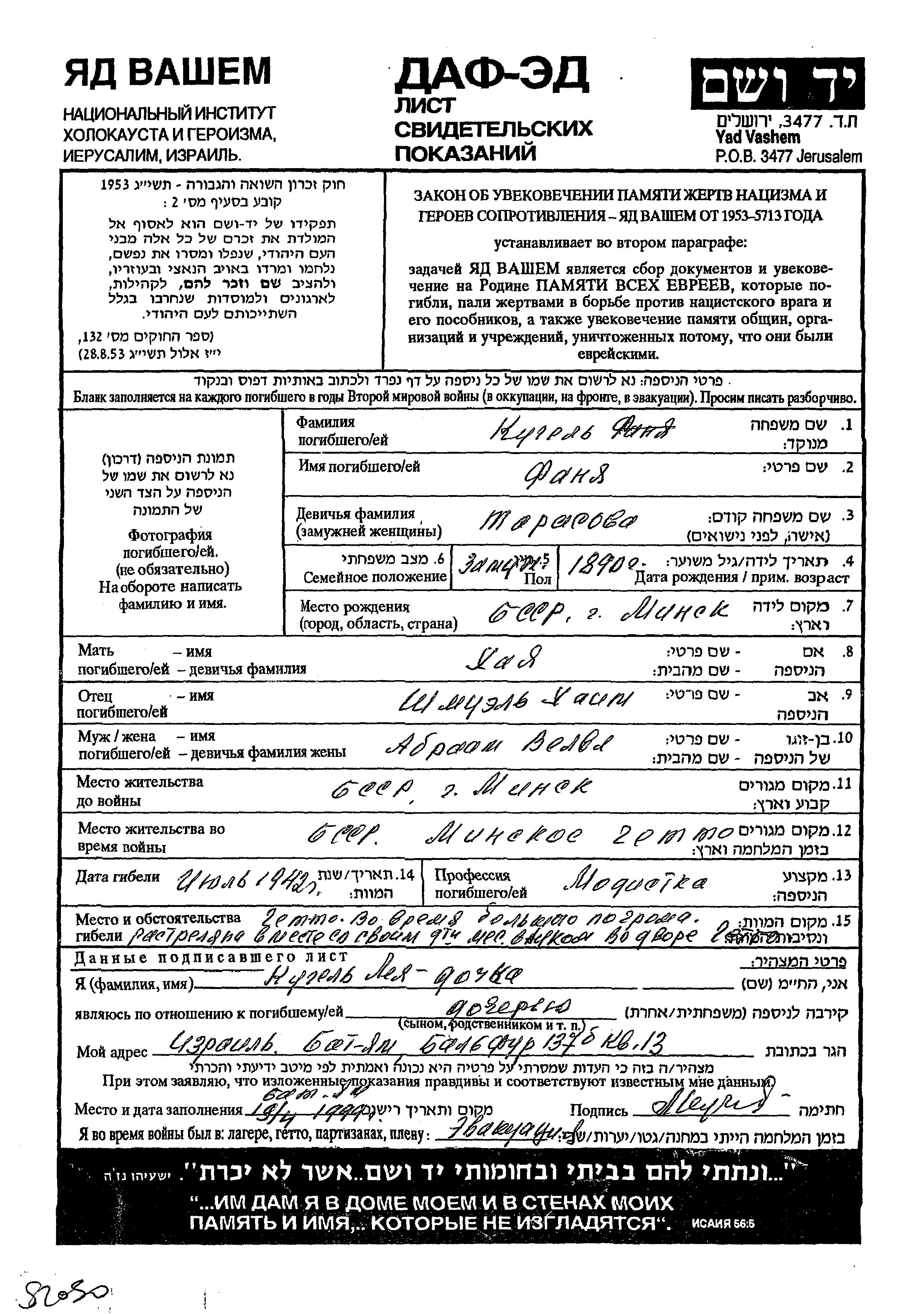 Fanya wurde in der Schoah ermordet. Todesort: Minsk, Weißrussland (UdSSR) im Jahr 07/1942.