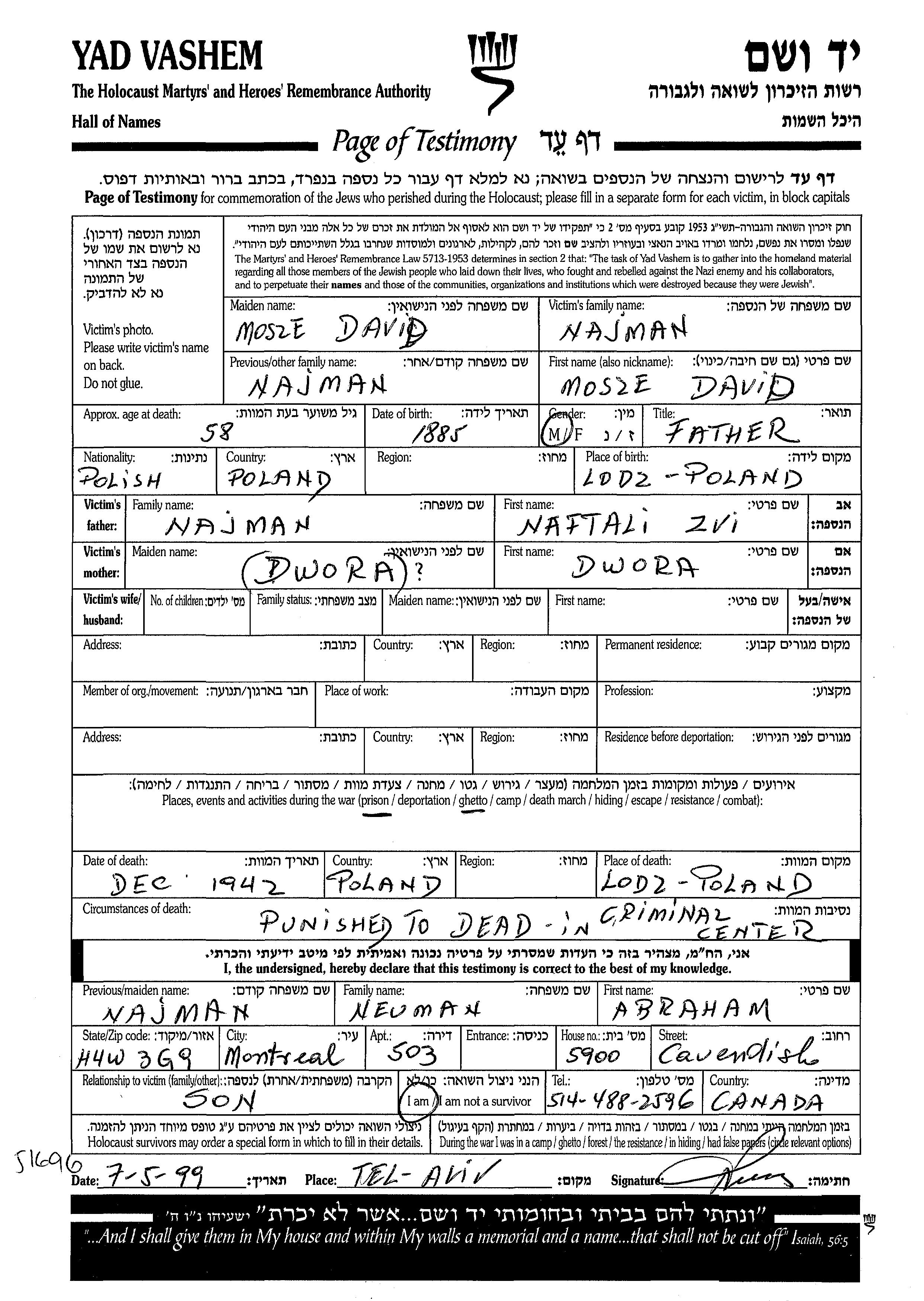 Mosze David Najman wurde im Jahr 1885 in Lodz, Polen geboren. Er war der Sohn von Naftali Zvi und Dwora.