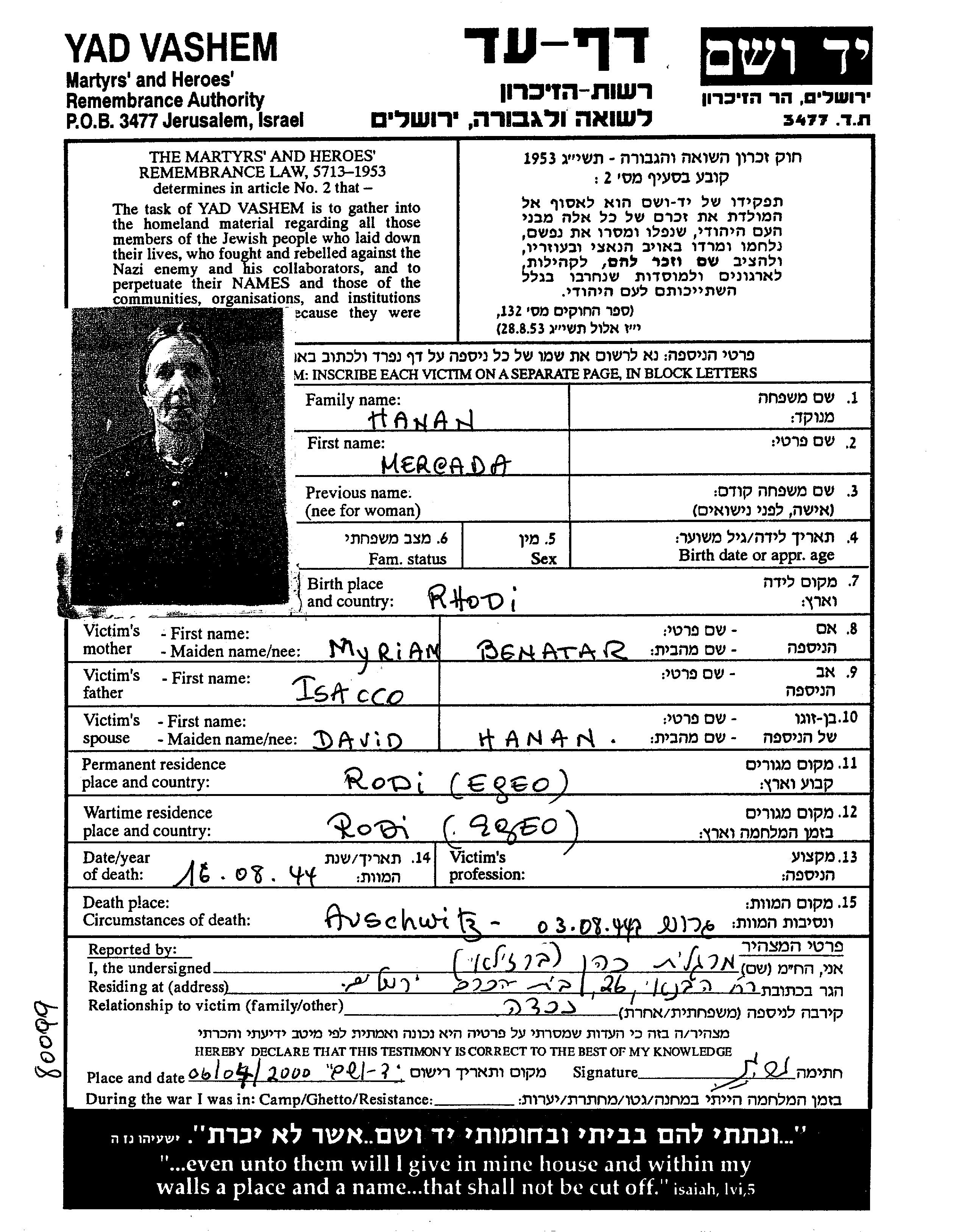 Diamanti Mercada wurde in der Schoah ermordet. Todesort: unbekannt im Jahr 1944.