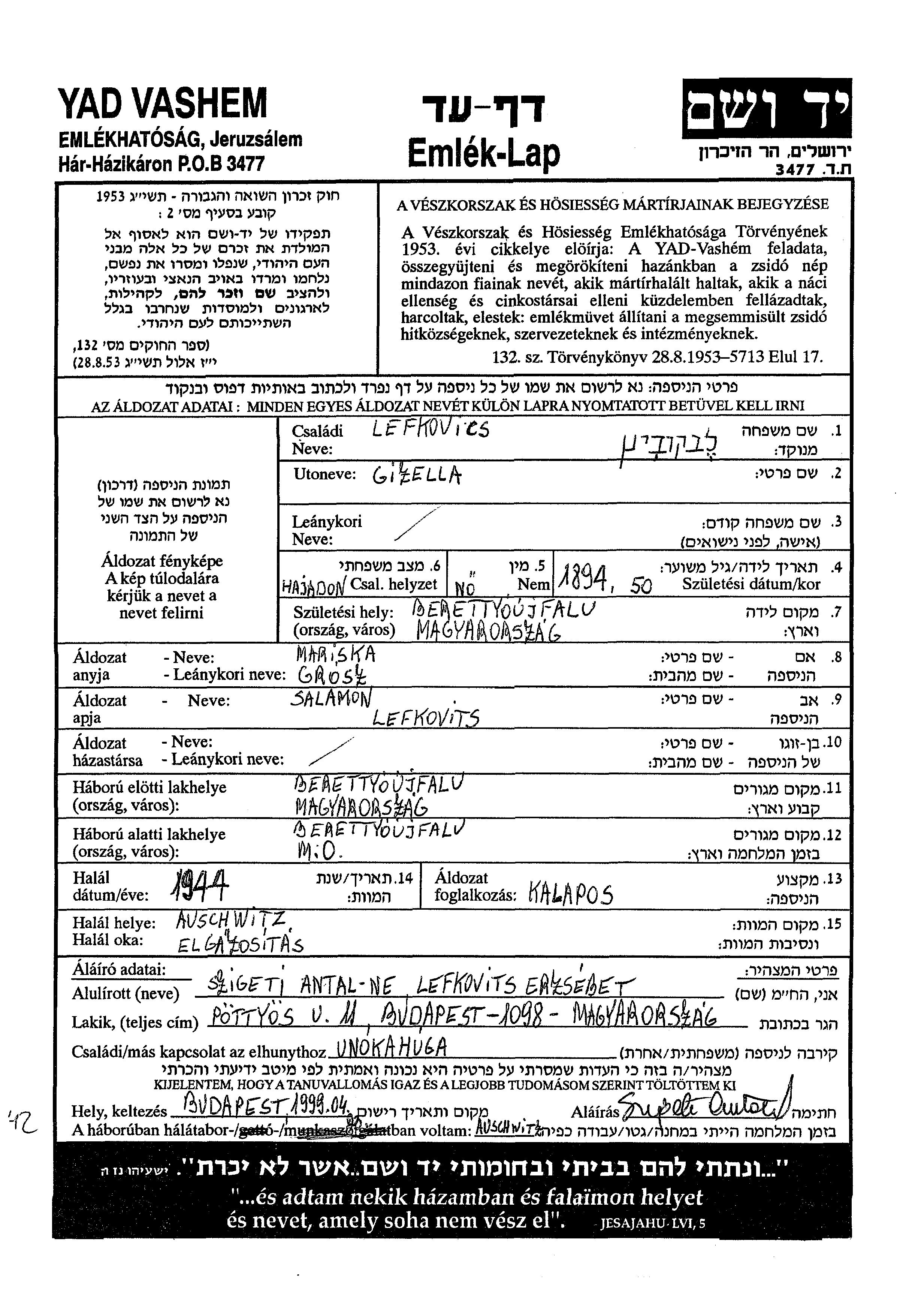 Gizella Lefkovics wurde im Jahr 1894 in Told, Ungarn geboren. Sie war die Tochter von Salamon und Mariska. Sie war Hutmacher/-in und Ledig. Vor dem Zweiten Weltkrieg lebte sie in Falubattyan, Ungarn. Während des Krieges war sie in Falubattyan, Ungarn.