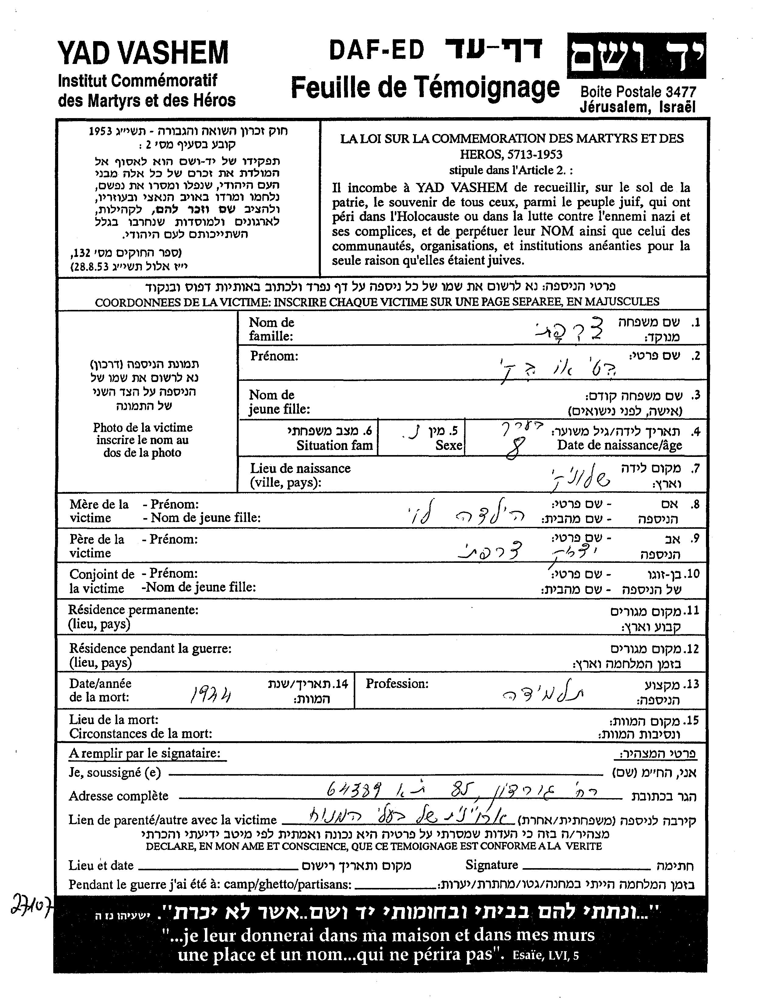 Tzarfati Beti Rivka unbekannter Ort, Gedenkblatt