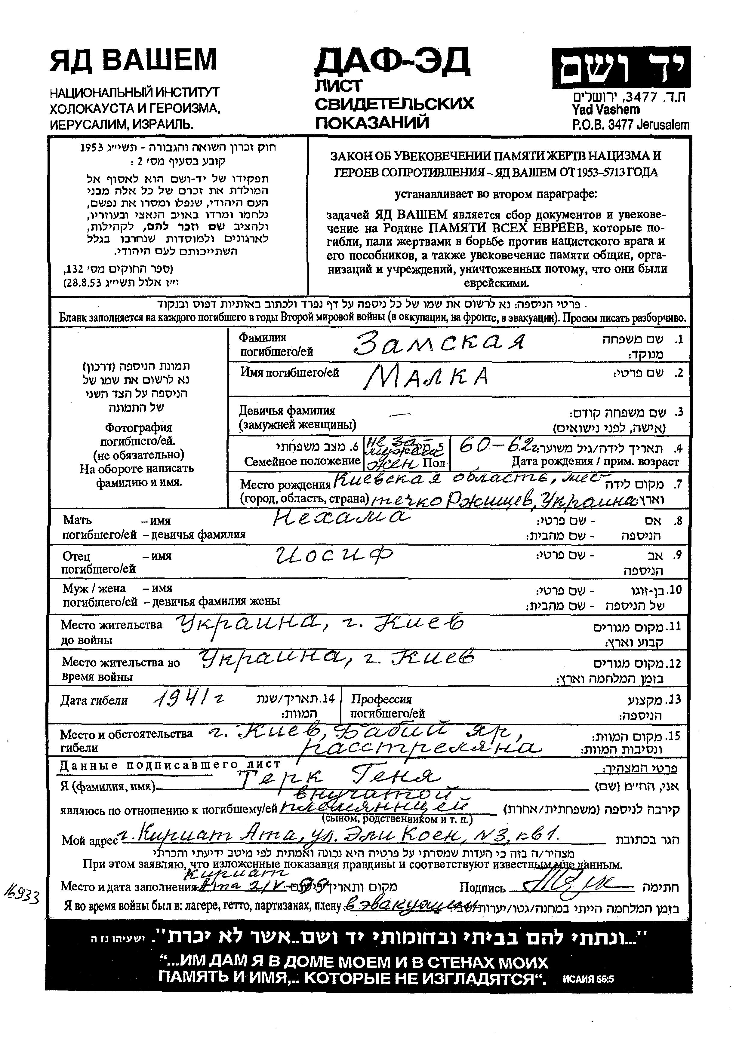Malka Zamski wurde in Rzhishchev, Ukraine (UdSSR) geboren. Sie war die Tochter von Iosif und Nekhama. Sie war Ledig. Vor dem Zweiten Weltkrieg lebte sie in Kiev, Ukraine (UdSSR). Während des Krieges war sie in Kiev, Ukraine (UdSSR).
