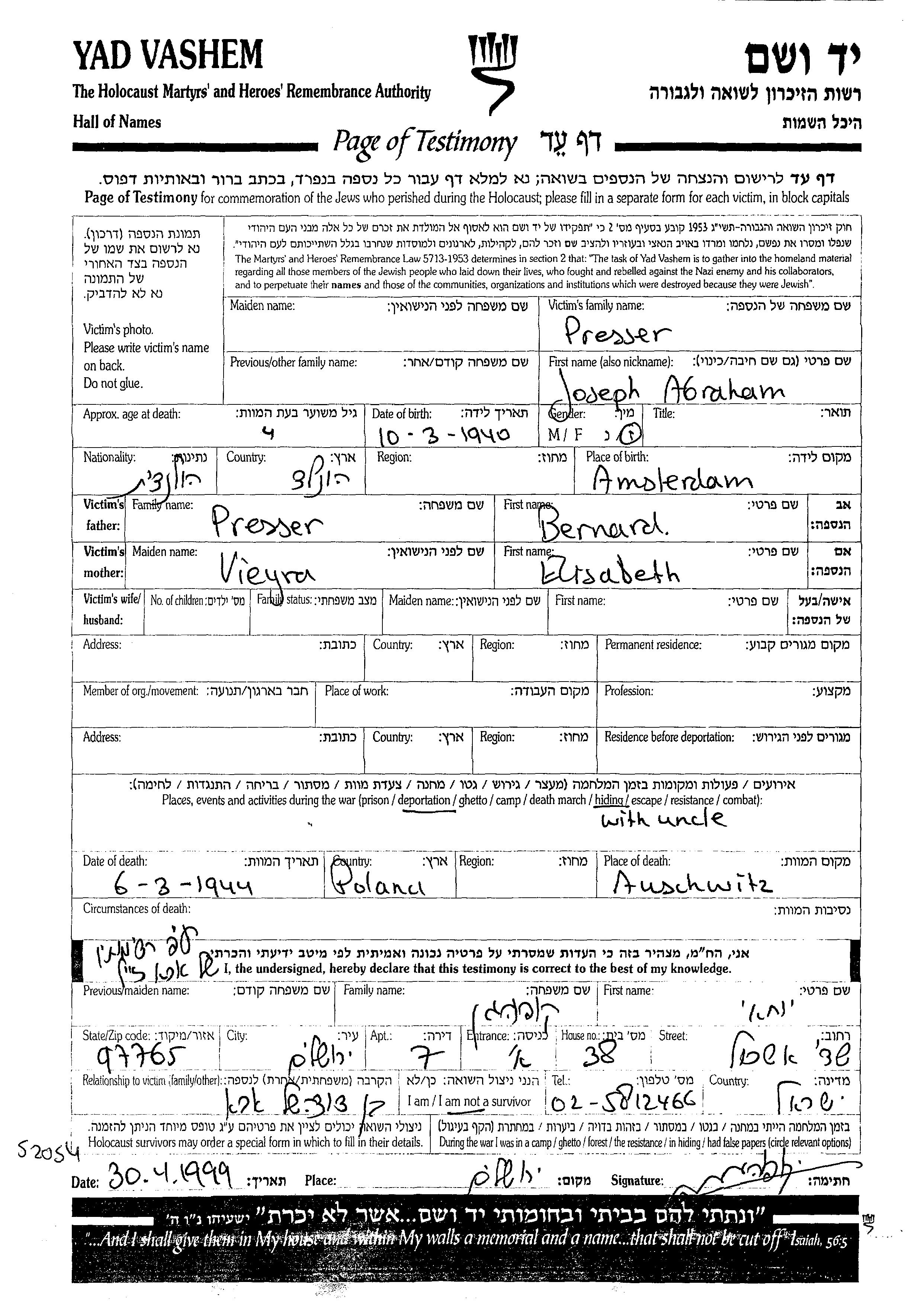 Joseph Abraham Presser wurde im Jahr 1940 in Amsterdam, Niederlande geboren. Er war der Sohn von Bernard und Elisabeth. Joseph Abraham wurde in der Schoah ermordet. Todesort: Auschwitz, Polen im Jahr 06/03/1944.