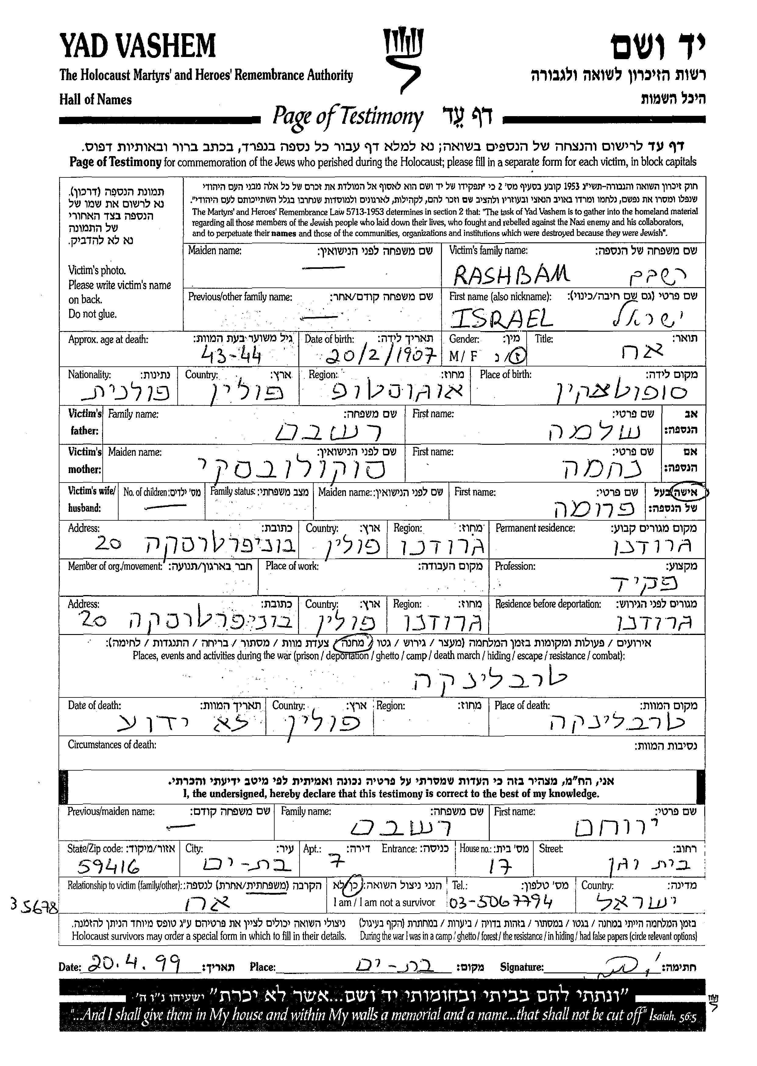 Israel wurde in der Schoah ermordet. Todesort: Treblinka, Polen.