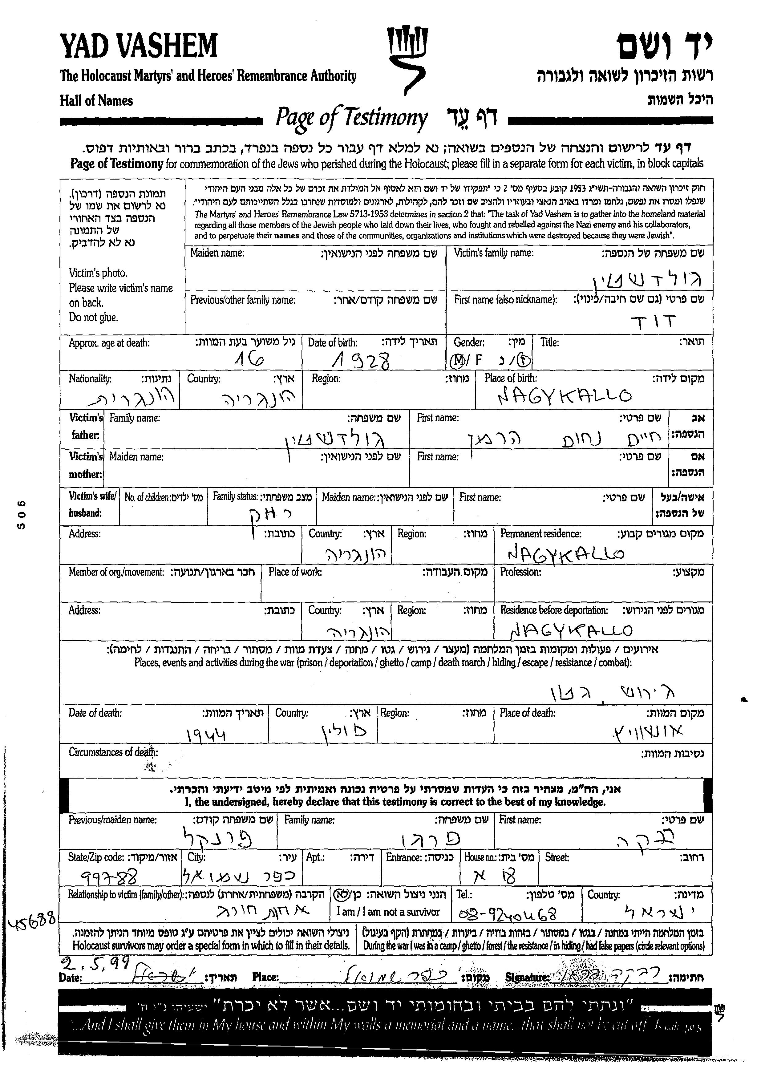 Goldshtein David 1928 Nagykallo, Ungarn Gedenkblatt