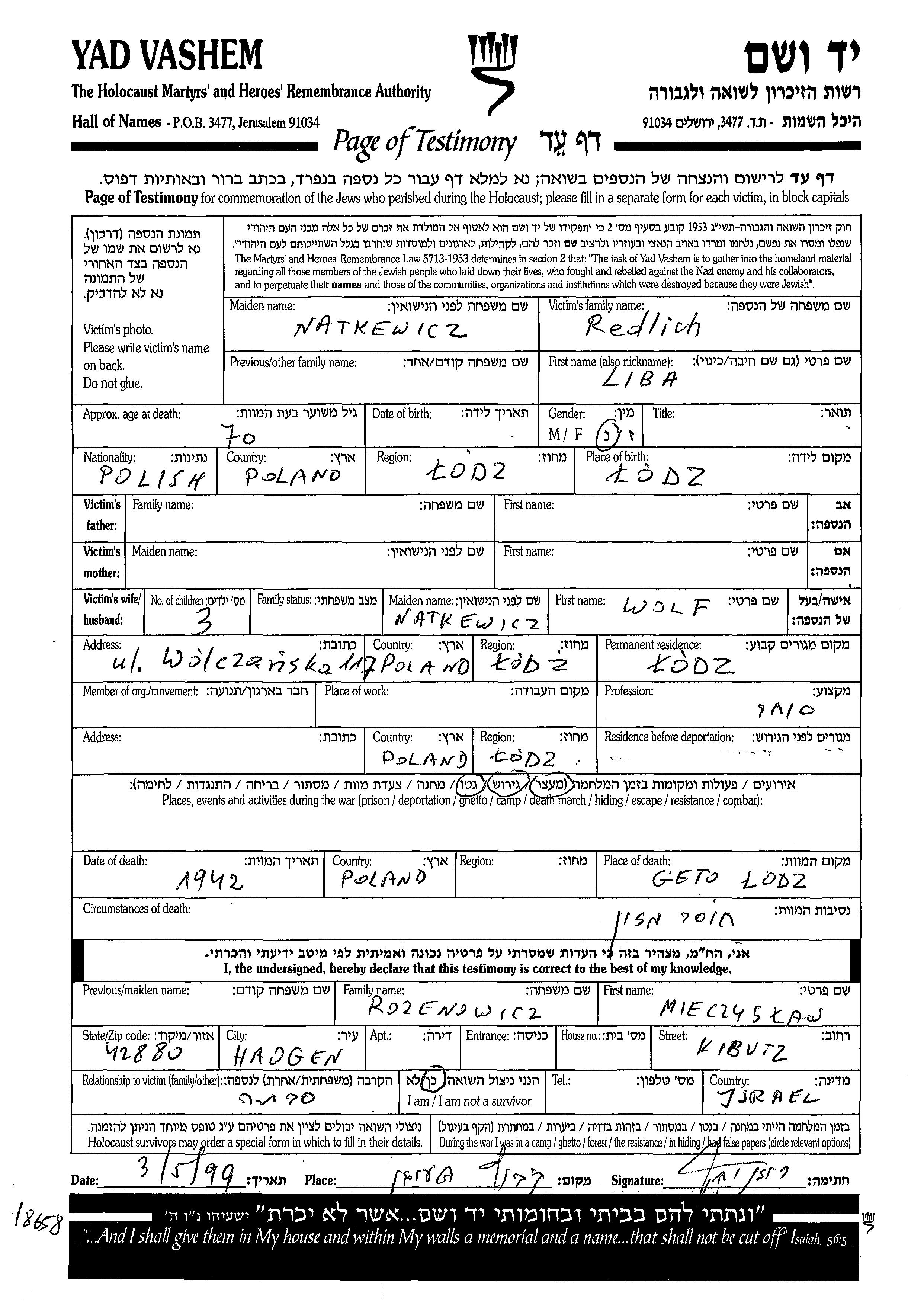 Liba Redlich, geb. Natkewicz wurde in Lodz, Polen geboren. Vor dem Zweiten Weltkrieg lebte sie in Lodz, Polen. Während des Krieges war sie in Lodz, Polen.