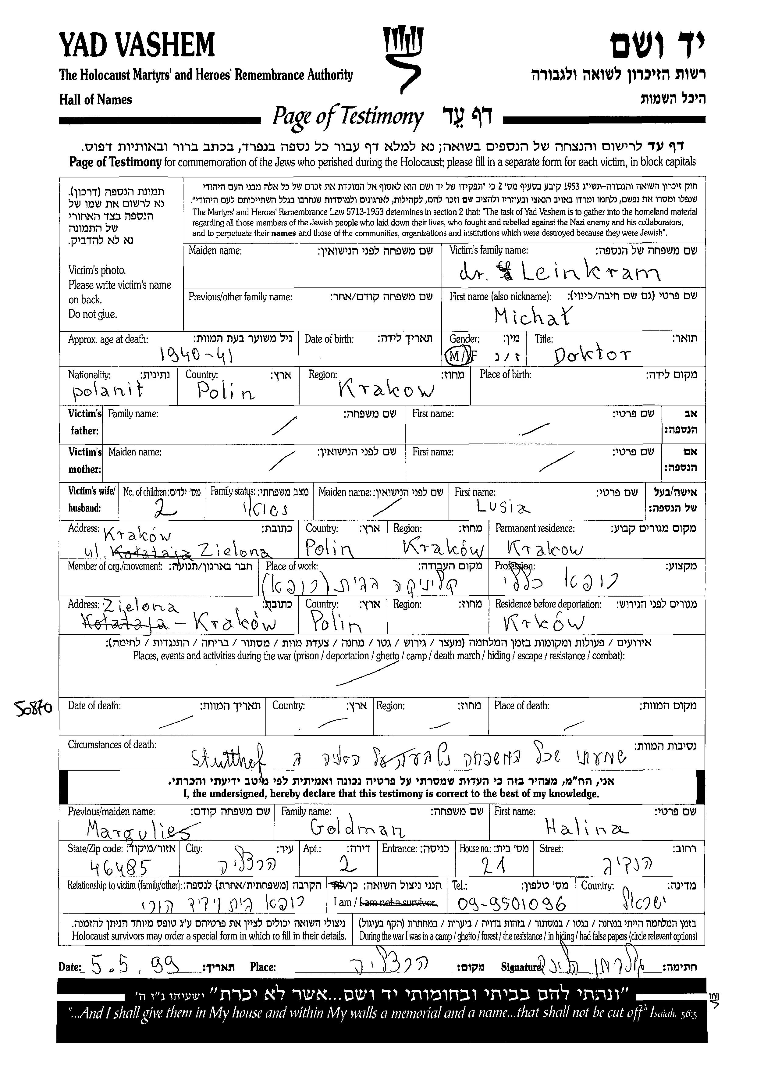 Dr. Michal Leinkram wurde in Krakow, Polen geboren. Er war Arzt für allgemeinmedizin und mit Lusia Verheiratet. Vor dem Zweiten Weltkrieg lebte er in Krakow, Polen. Während des Krieges war er in Krakow, Polen.