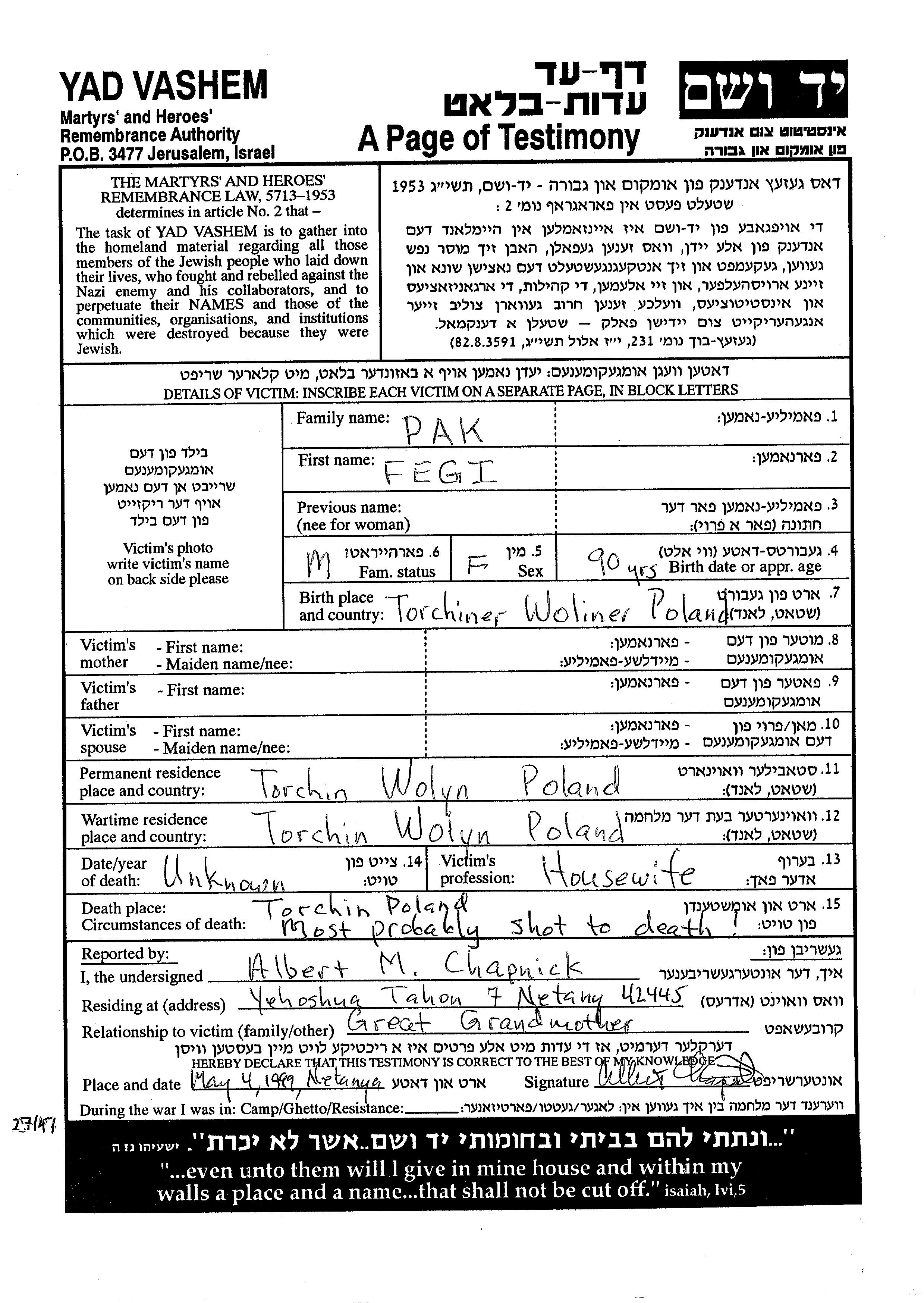Fegi Pak wurde in Torchin, Polen geboren. Sie war Hausfrau und Verheiratet. Vor dem Zweiten Weltkrieg lebte sie in Torchin, Polen. Während des Krieges war sie in Torchin, Polen.