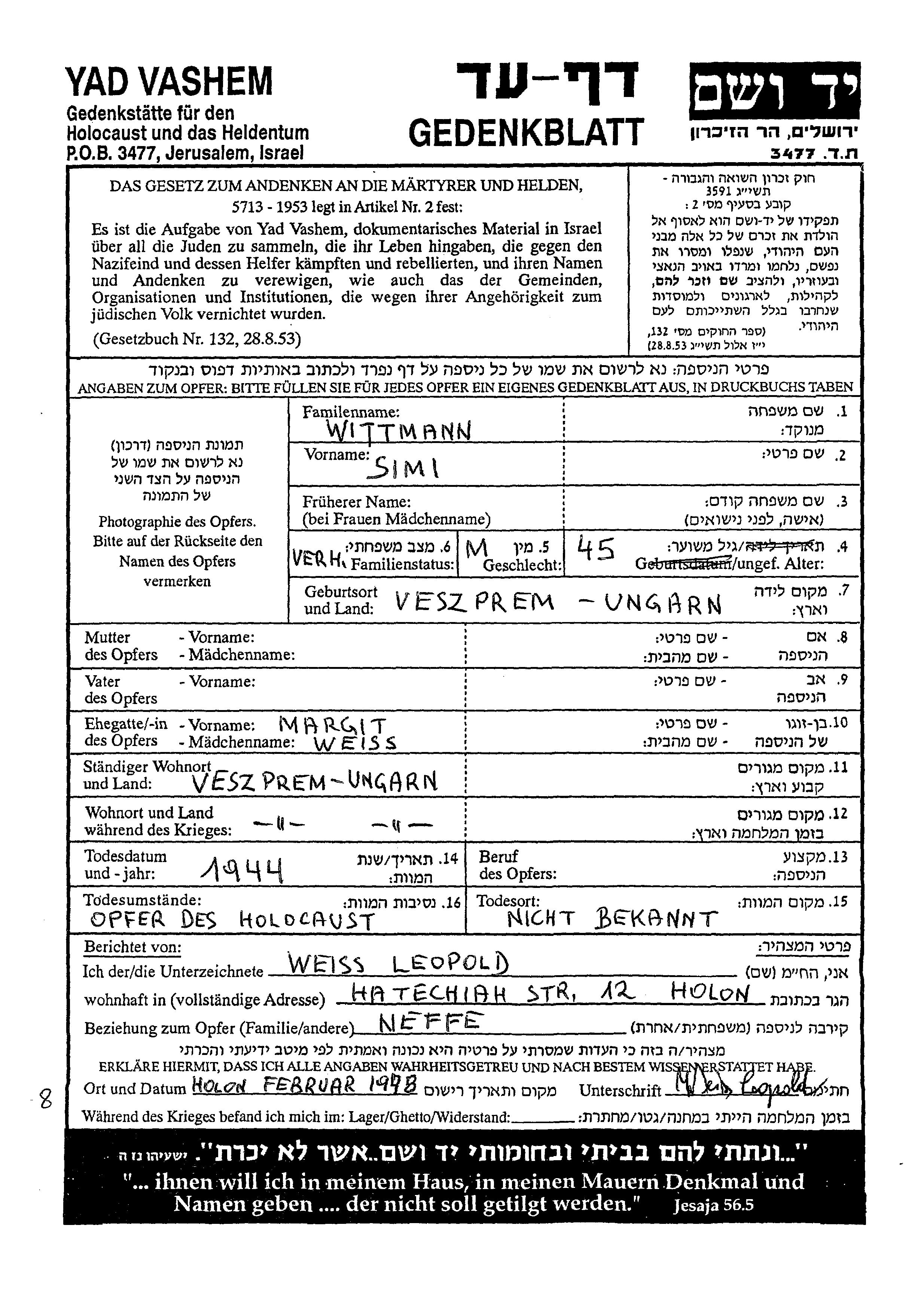 Simi Wittmann wurde in Veszprem, Ungarn geboren. Er war mit Margit, geb. Weiss Verheiratet. Vor dem Zweiten Weltkrieg lebte er in Veszprem, Ungarn. Während des Krieges war er in Veszprem, Ungarn.