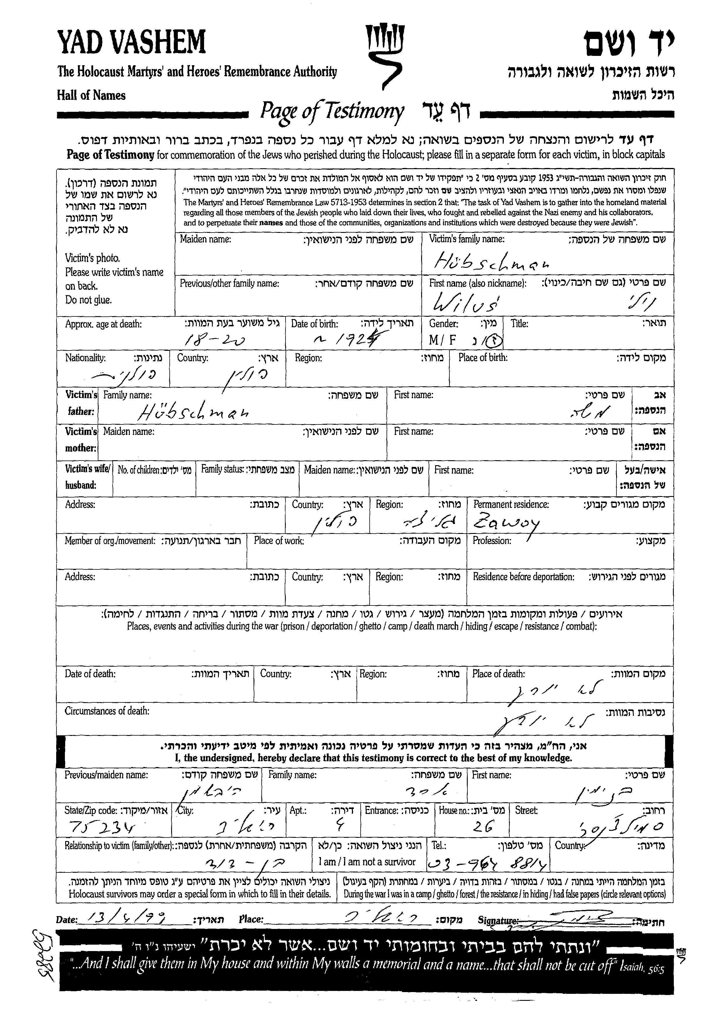 Wilus Vilhelm Hubschman wurde im Jahr 1924 in Polen geboren. Er war der Sohn von Moshe. Vor dem Zweiten Weltkrieg lebte er in Zawoj, Polen.