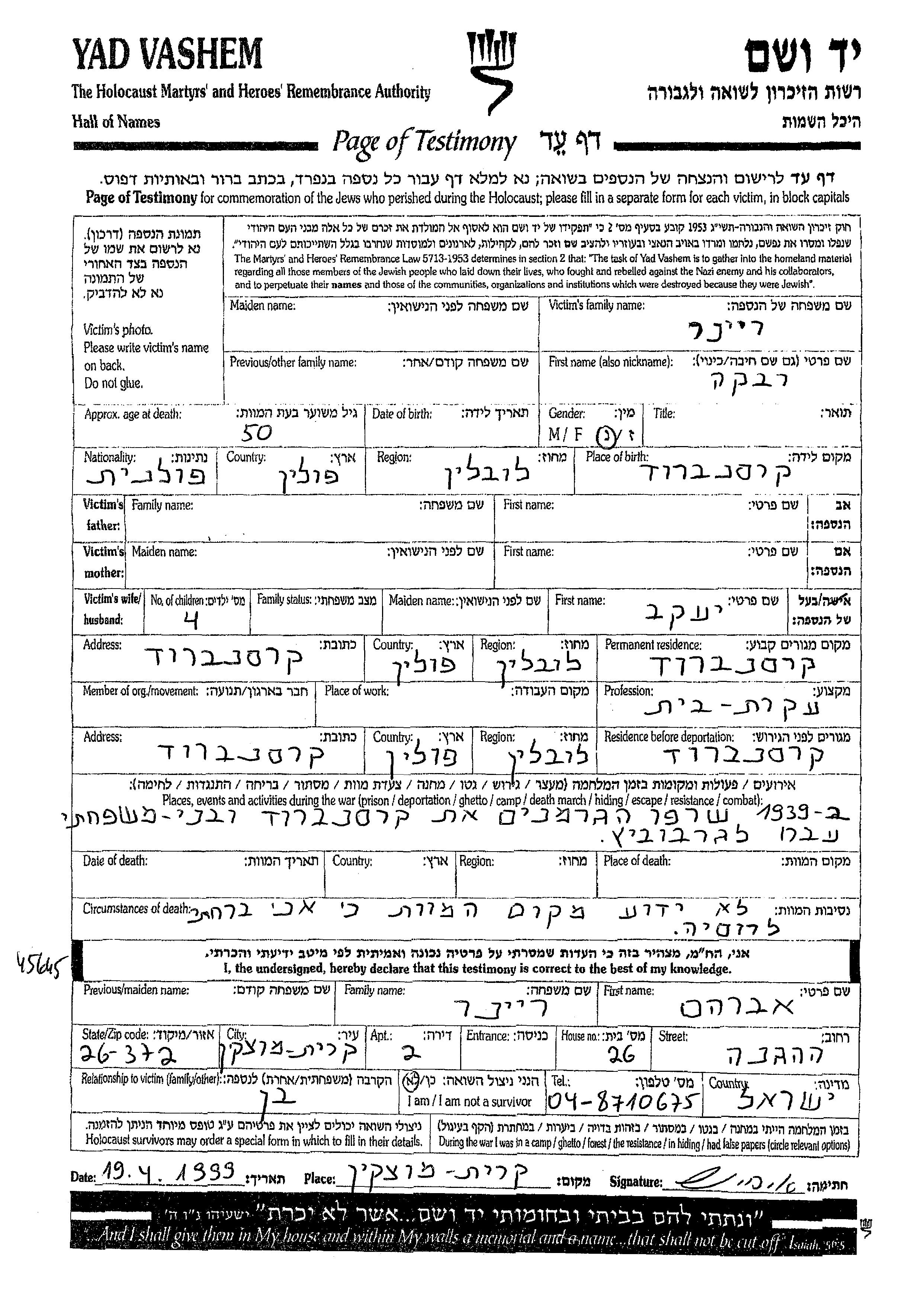 Rivka Reiner wurde in Krasnobrod, Polen geboren. Sie war Hausfrau und mit Yaakov Verheiratet. Vor dem Zweiten Weltkrieg lebte sie in Krasnobrod, Polen. Während des Krieges war sie in Krasnobrod, Polen.