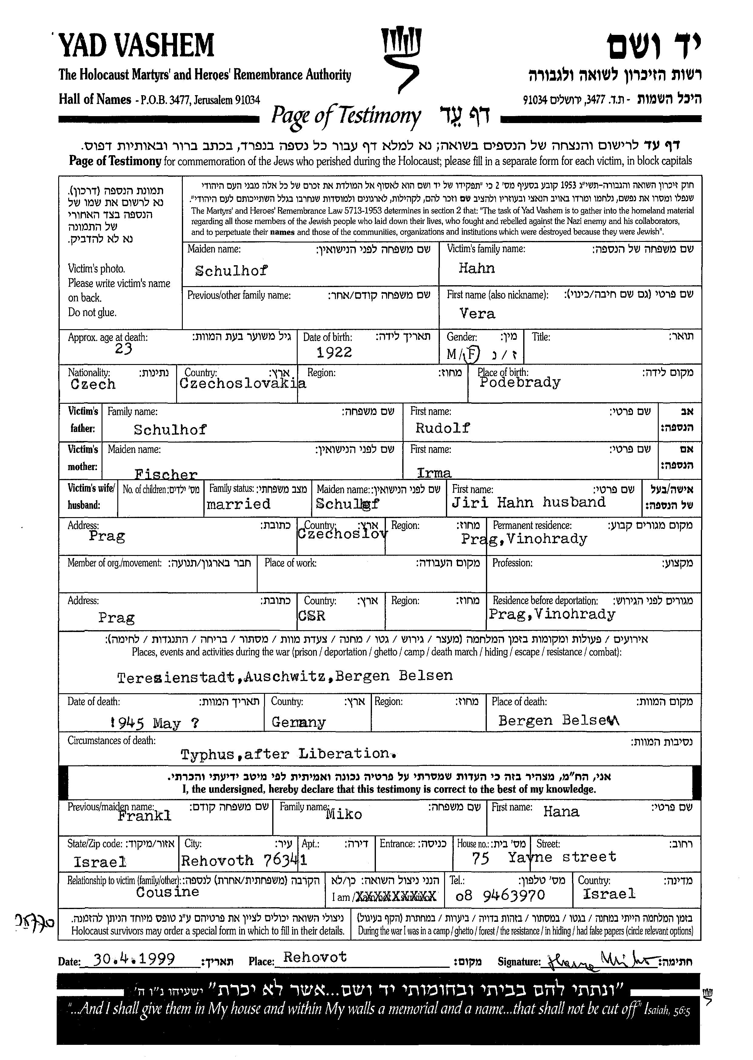Vera Hahn, geb. Schulhof wurde im Jahr 1922 in Podebrady, Tschechoslowakei geboren. Sie war die Tochter von Rudolf und Irma. Sie war mit Jiri Verheiratet. Vor dem Zweiten Weltkrieg lebte sie in Prague, Tschechoslowakei. Während des Krieges war sie in Prague, Tschechoslowakei.