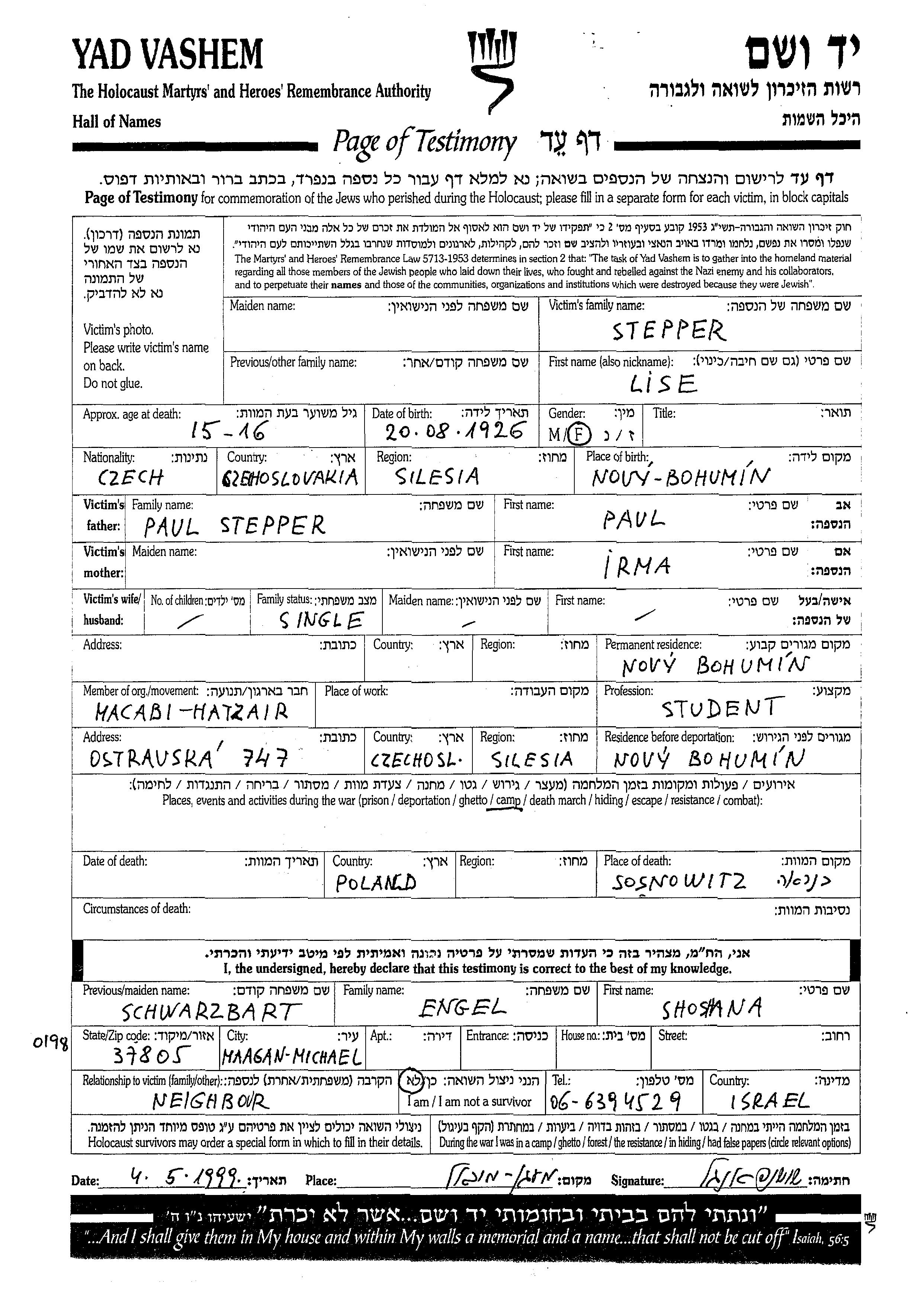 Lisa Stepper wurde im Jahr 1926 in Novy Bohumin, Tschechoslowakei geboren. Sie war die Tochter von Paul und Irma. Sie war Student und Ledig. Vor dem Zweiten Weltkrieg lebte sie in Novy Bohumin, Tschechoslowakei. Während des Krieges war sie in Novy Bohumin, Tschechoslowakei.