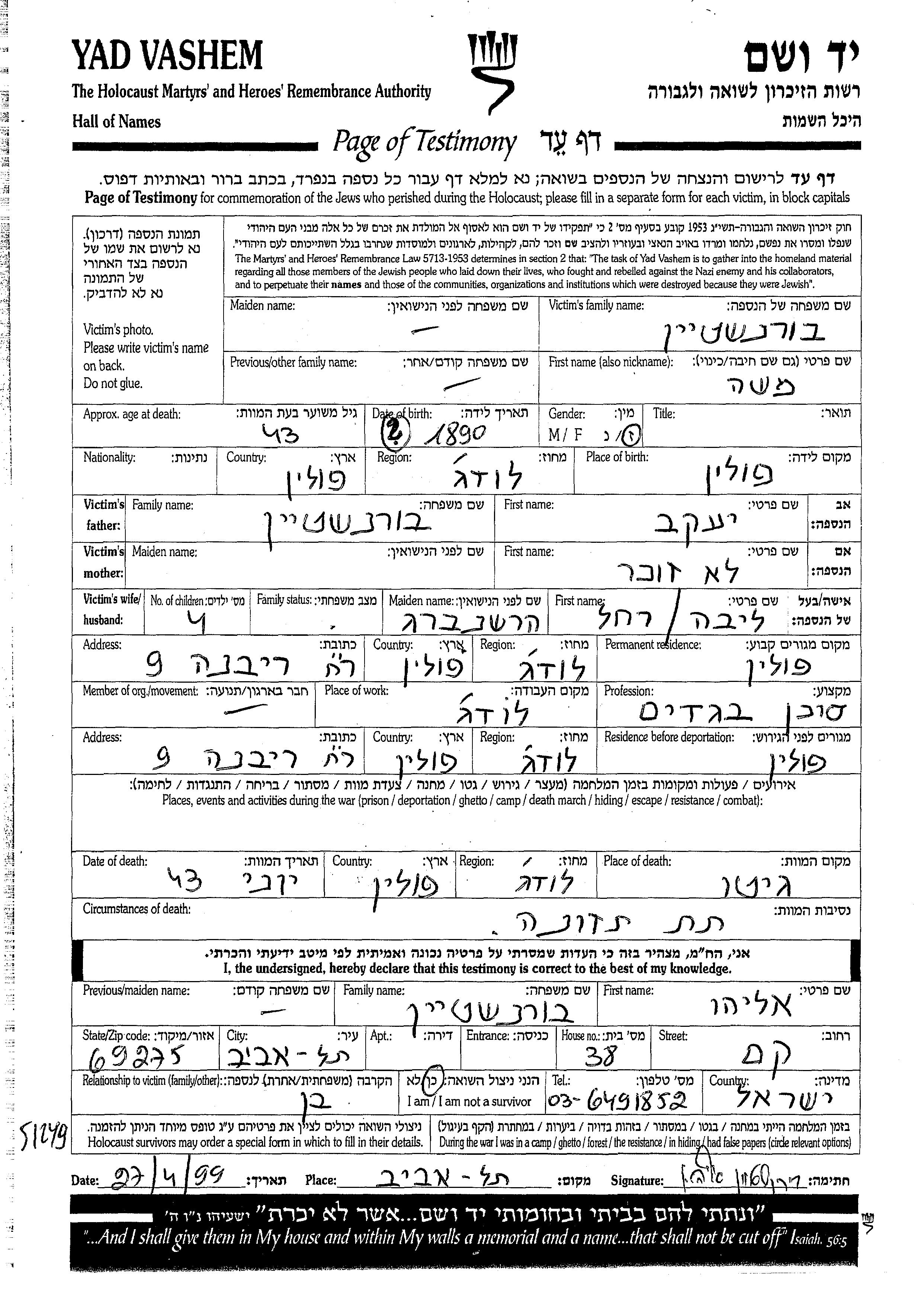 Moshe Bornshtein wurde im Jahr 1890 in Lodz, Polen geboren. Er war der Sohn von Yaakov. Er war Kleiderhändler und mit Liba Rakhel, geb. Hershenberg Verheiratet. Vor dem Zweiten Weltkrieg lebte er in Lodz, Polen. Während des Krieges war er in Lodz, Polen.
